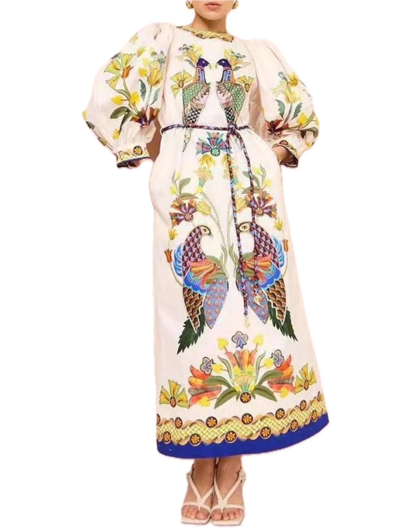 Women's Printed Round Neck Puff Sleeve Dress 100% Polyester with Pockets Lightweight Casual Everyday Wear for Women