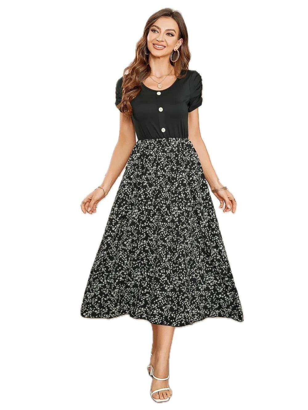 Women's Printed Round Neck Short Sleeve Midi Dress 95% Polyester 5% Spandex Blend for Everyday Elegant Look Chic Comfort