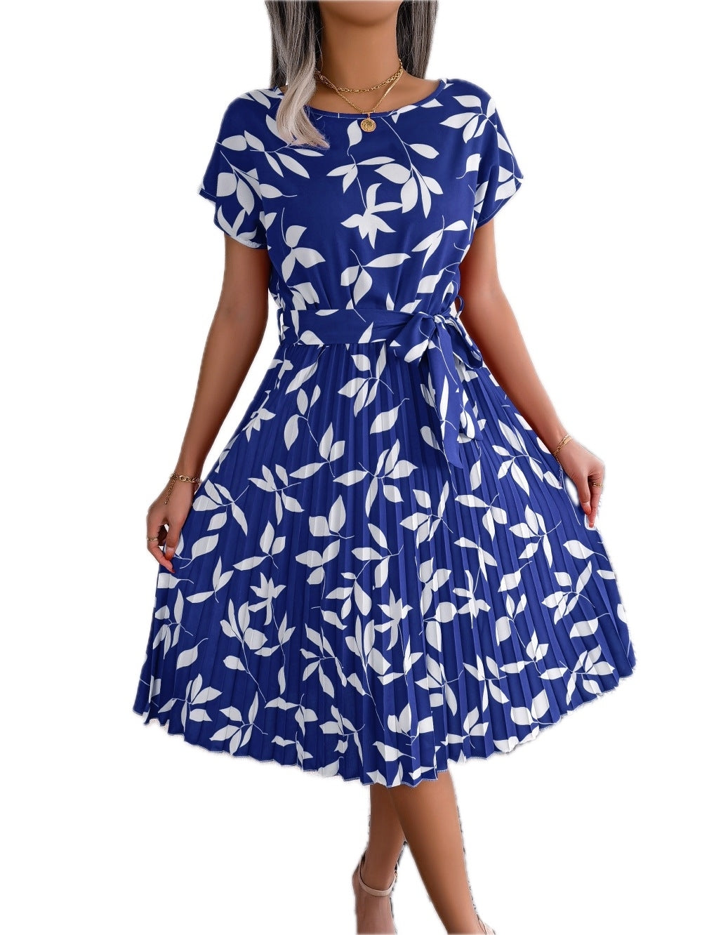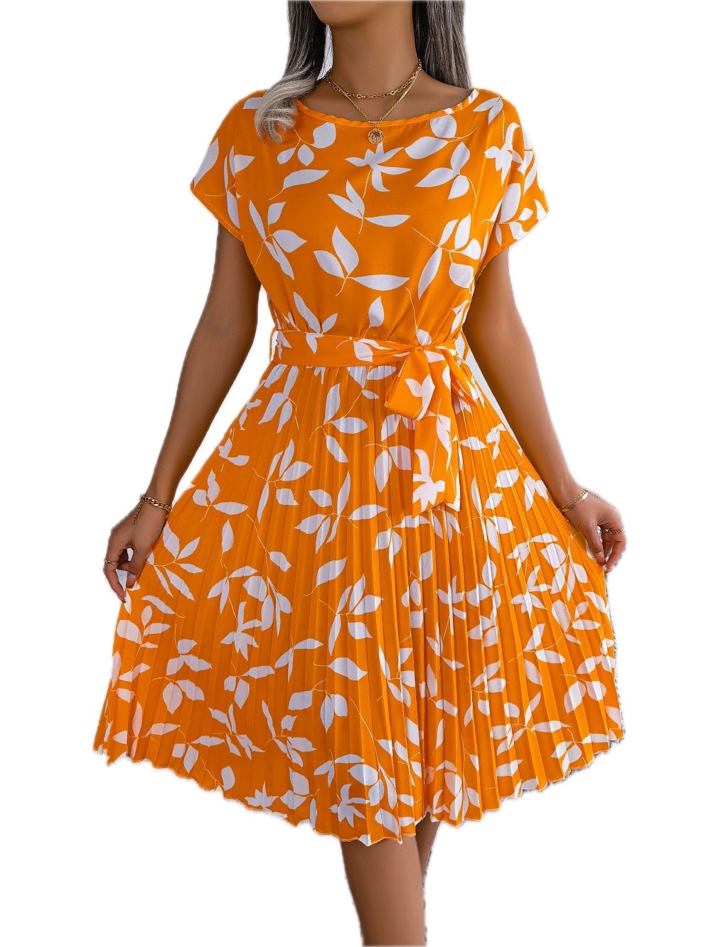 Women's Printed Round Neck Short Sleeve Pleated Dress Knee Length A Line Silhouette 100% Polyester Fabric Casual