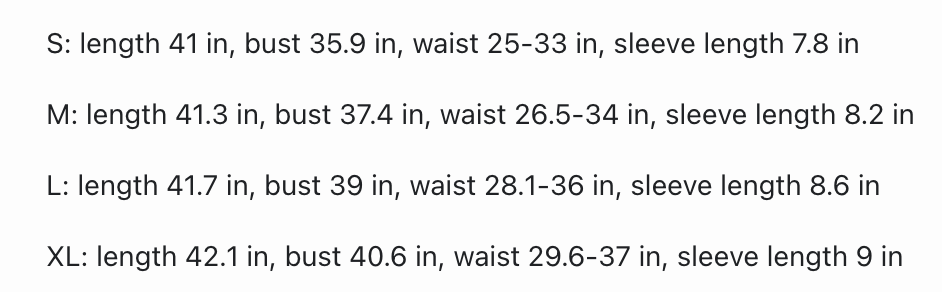M: length 41.3 in, bust 37.4 in, waist 26.5-34 in, sleeve length 8.2 in