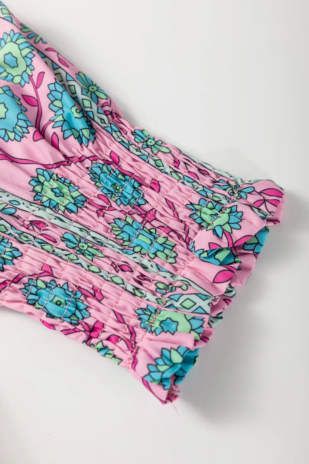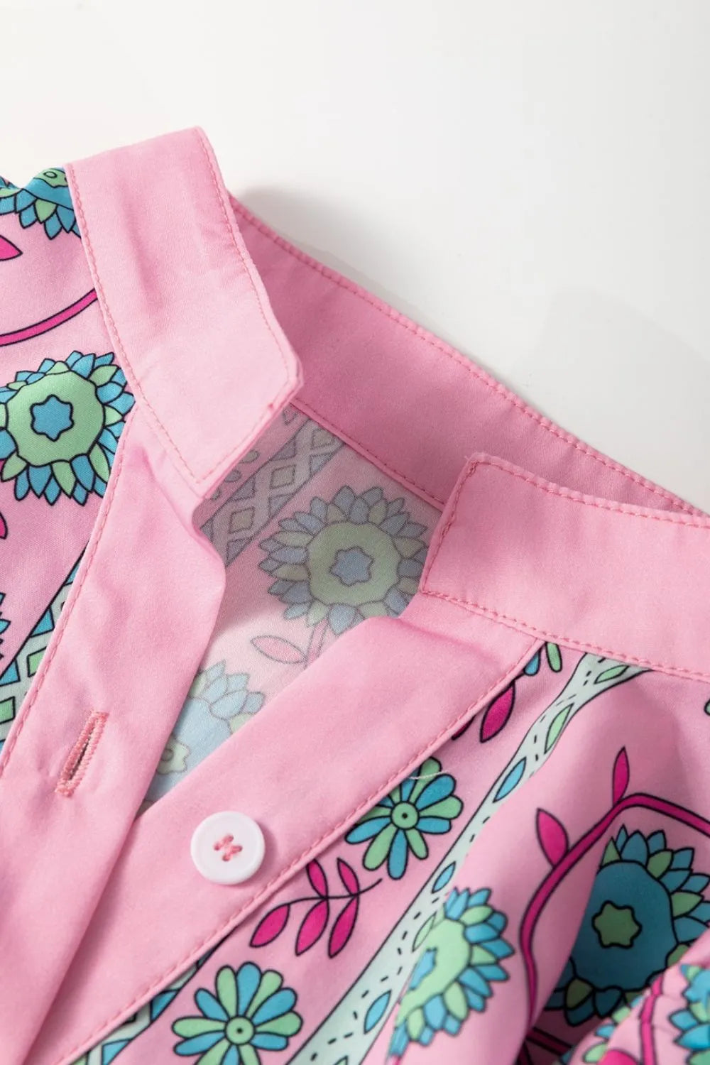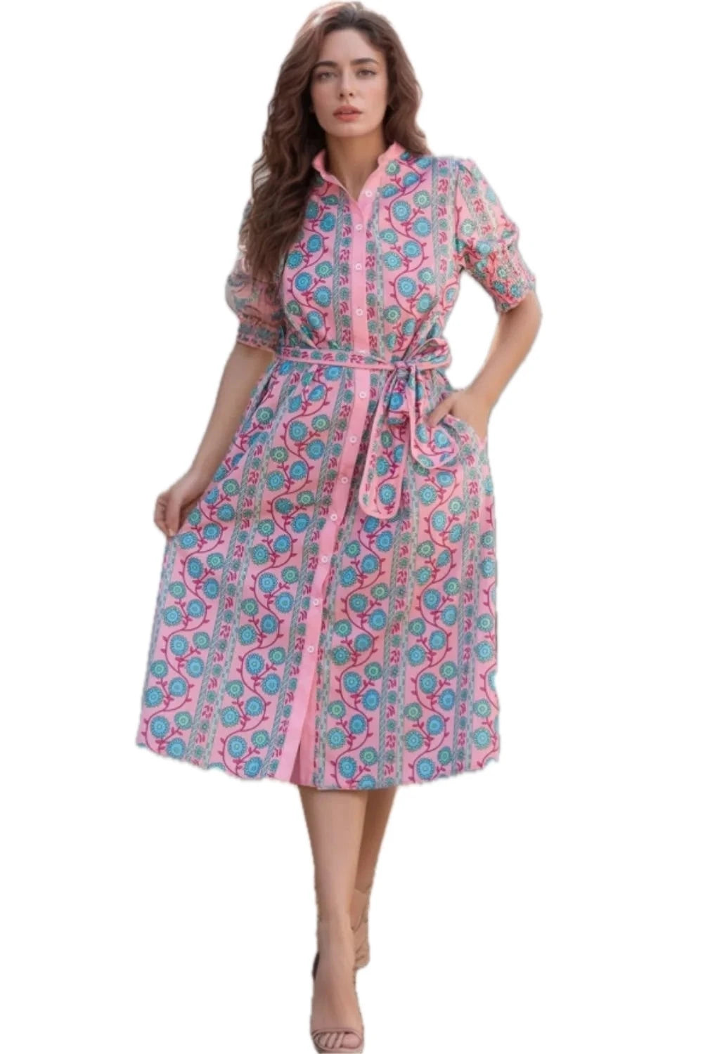 Women's Printed Shirred Sleeve Buttoned Front Midi Dress with Sash Elegant Style 100% Polyester Everyday Ready Outfit