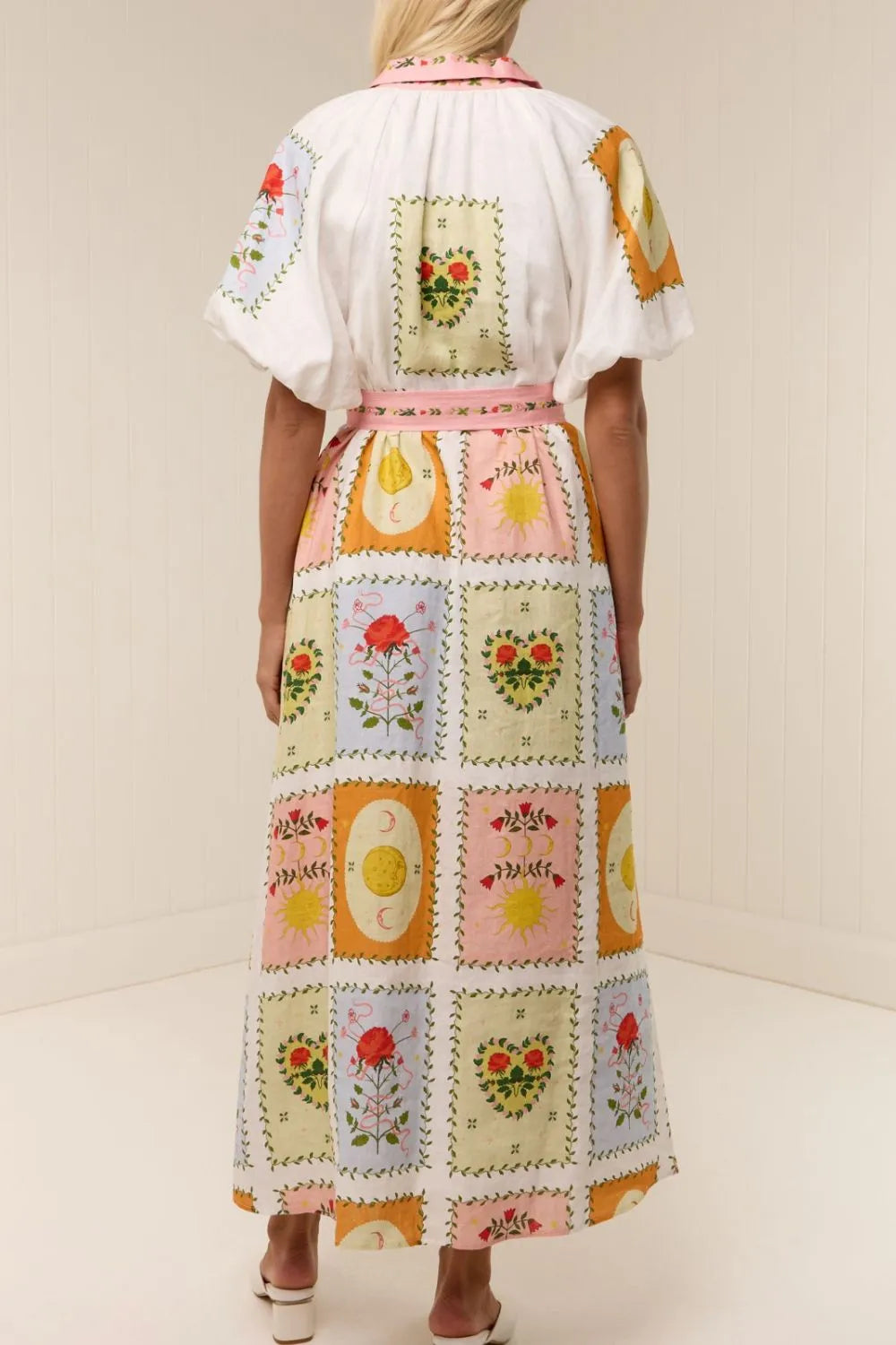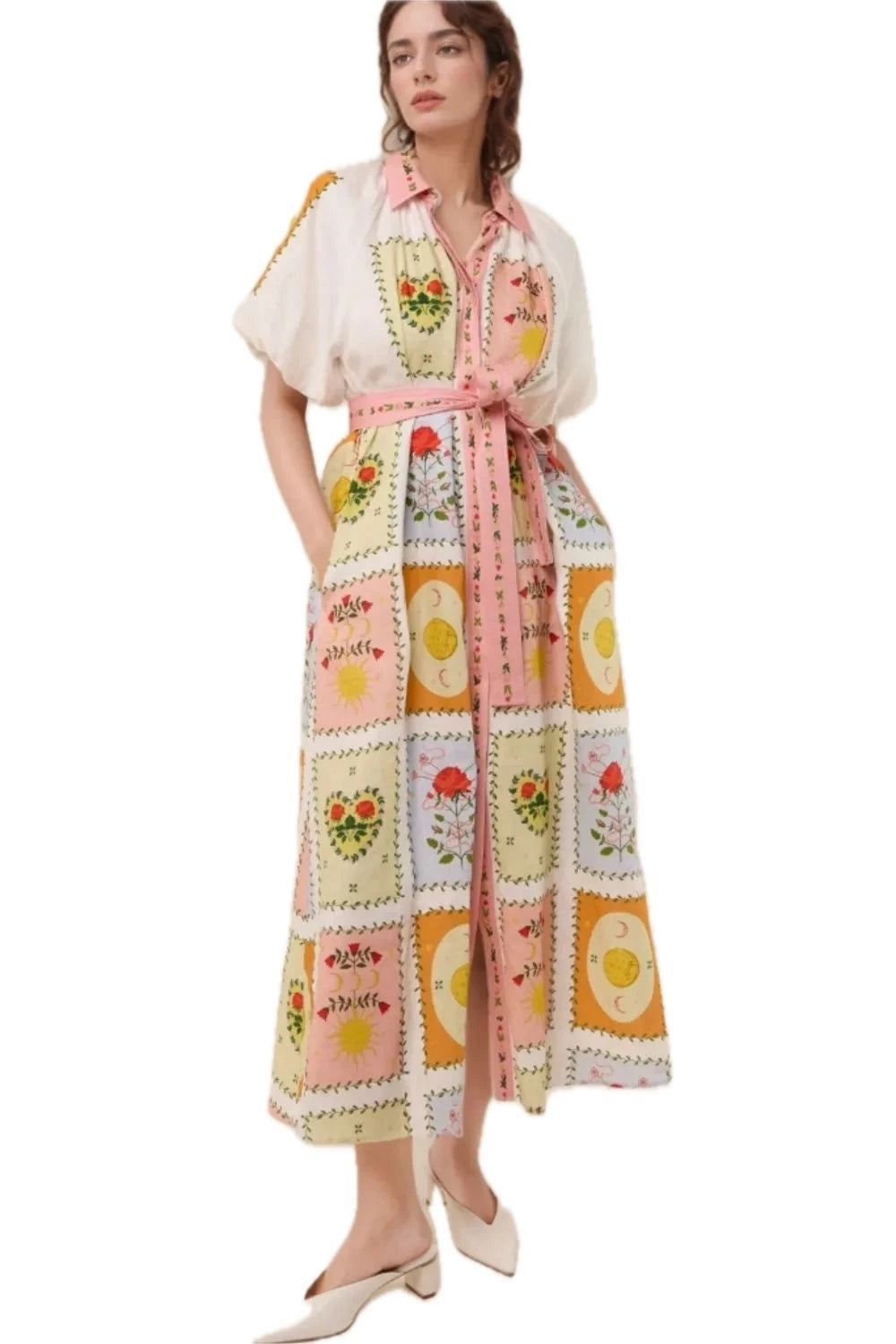 Women's Printed Short Sleeve Belted Maxi Dress 55% Linen 45% Polyester Lightweight Breathable Elegant Summer All Day
