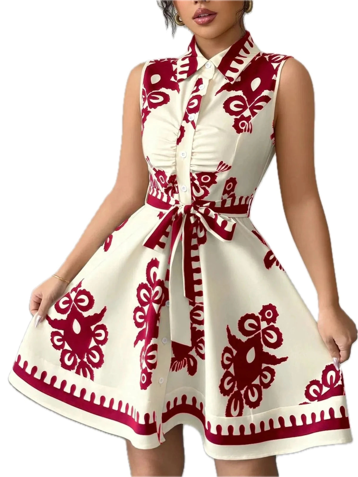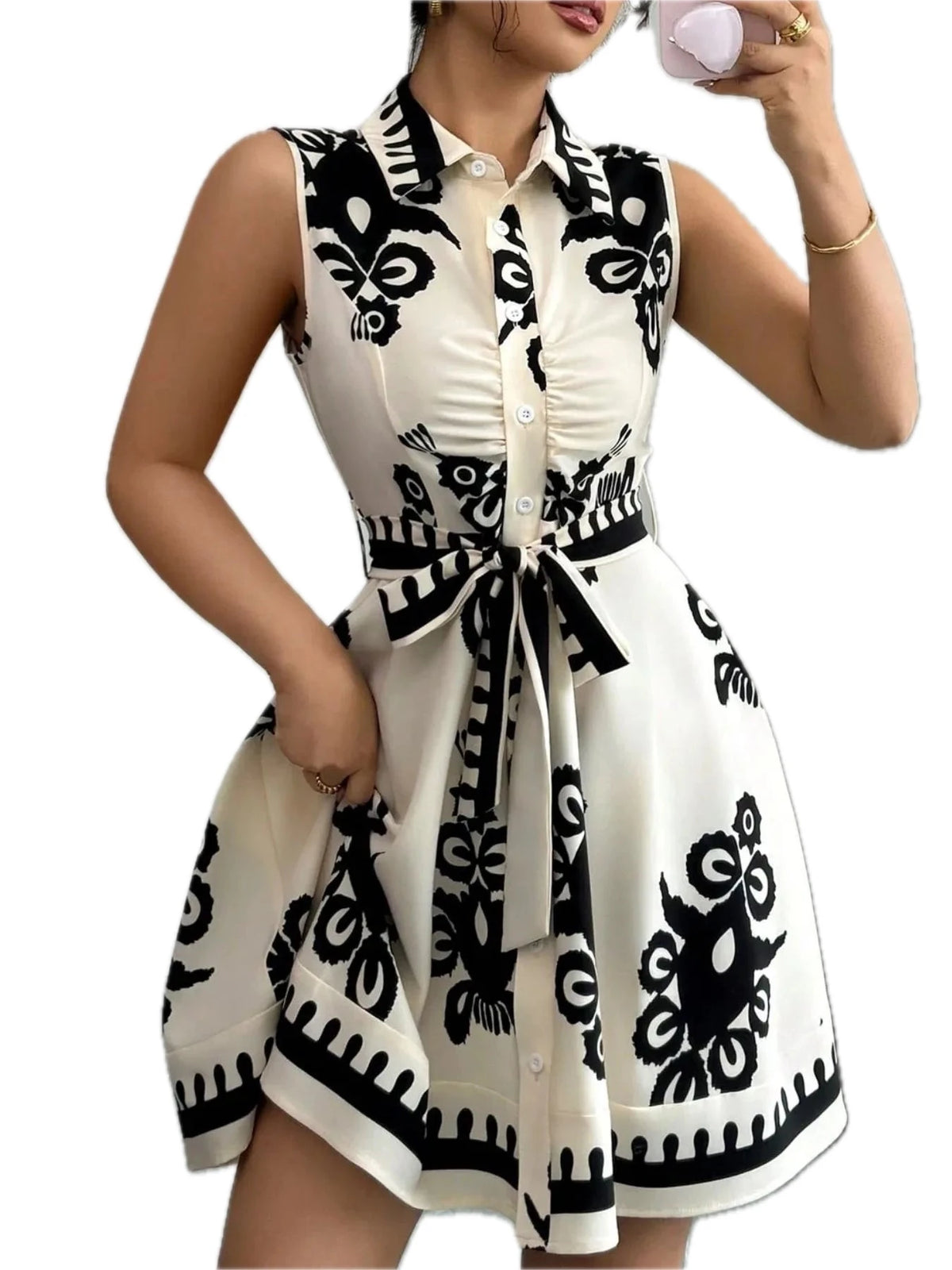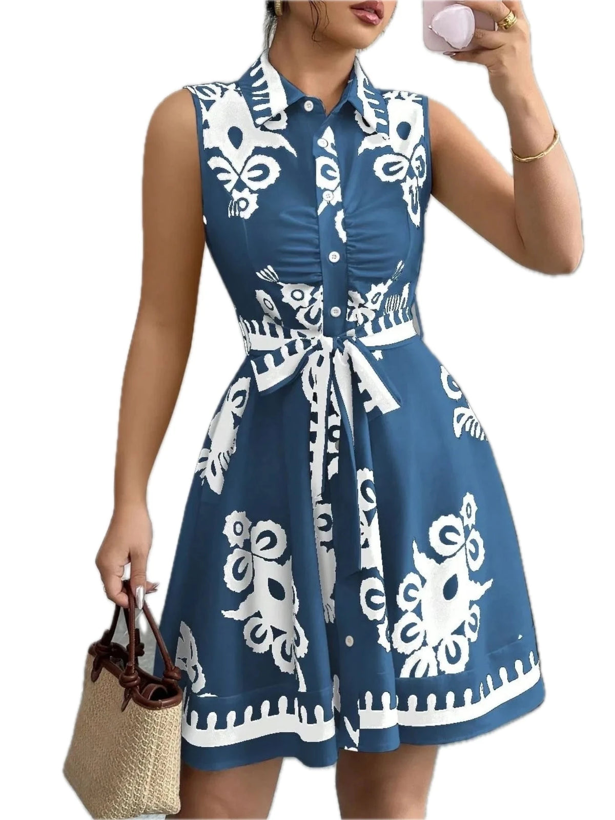 Women's Printed Sleeveless Tie Waist Mini Dress 100% Polyester Lightweight Breathable Summer Party Outfit Casual Chic