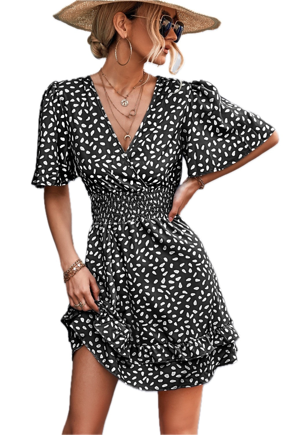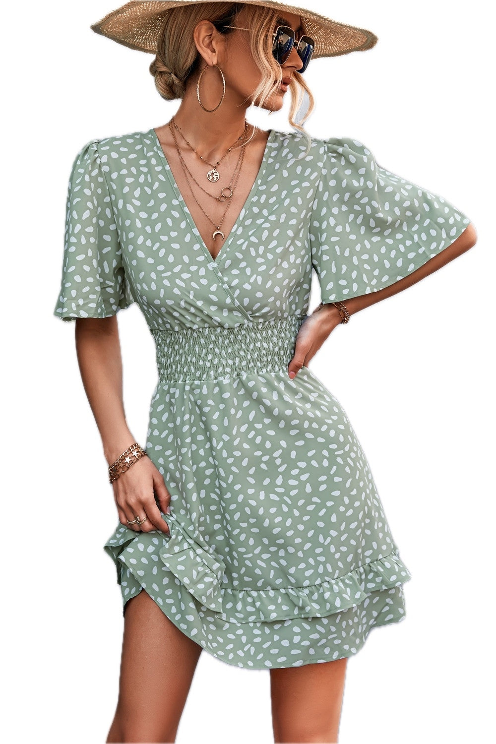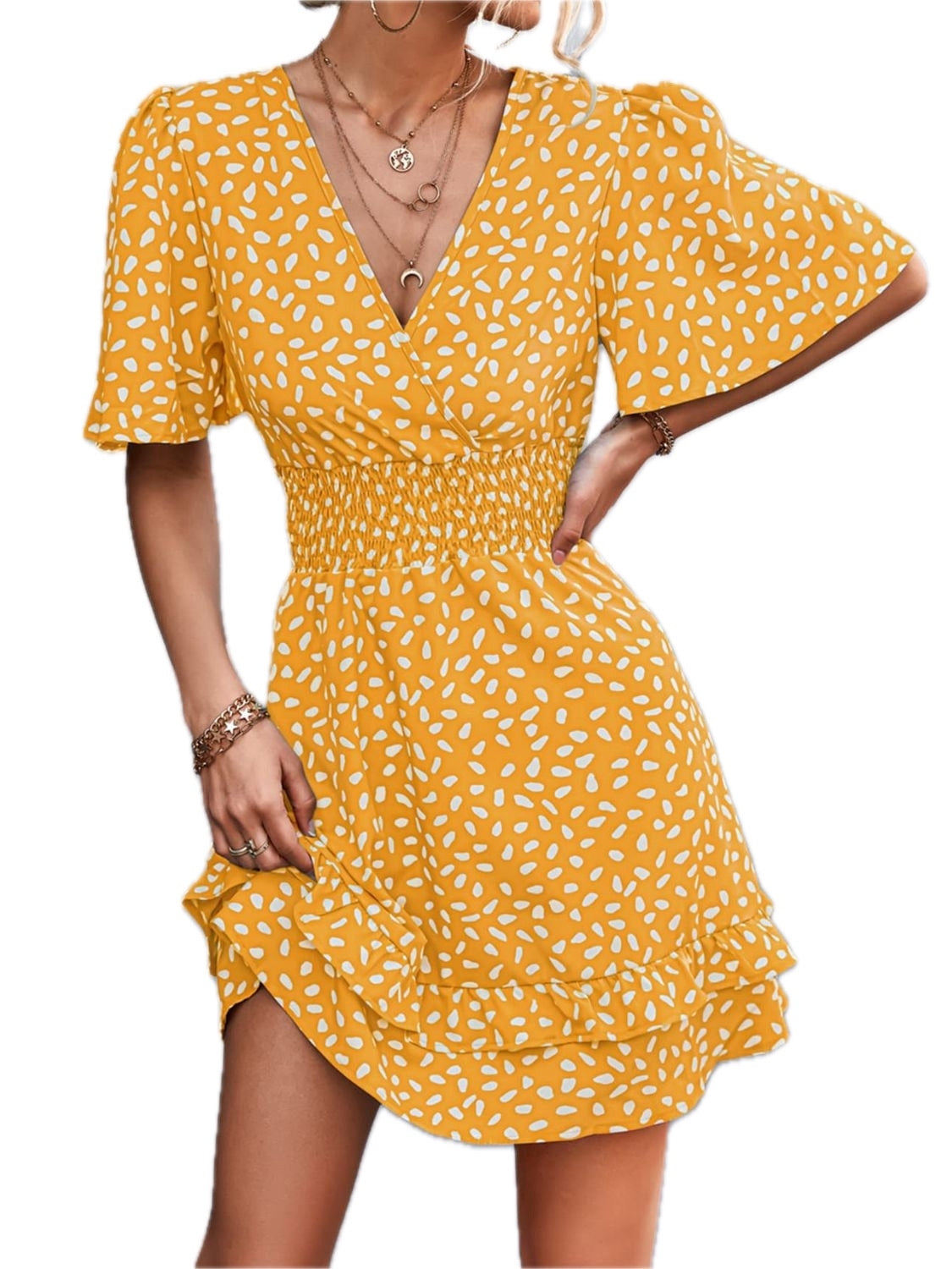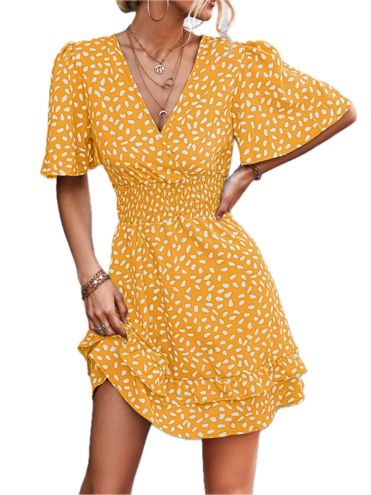 Women's Printed Smocked Waist Layered Surplice Dress Mini Length Flutter Sleeves 95% Polyester 5% Spandex Fabric