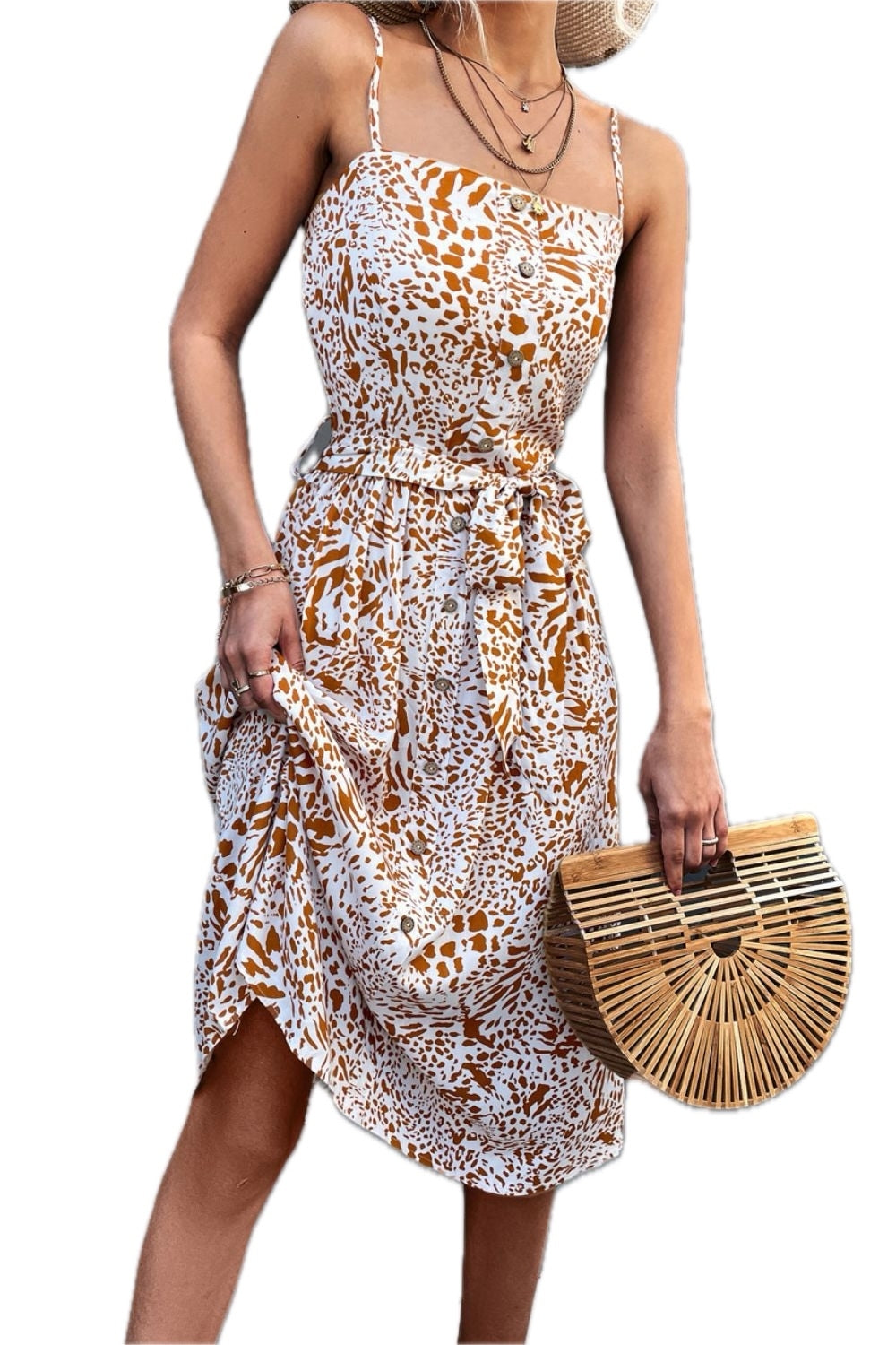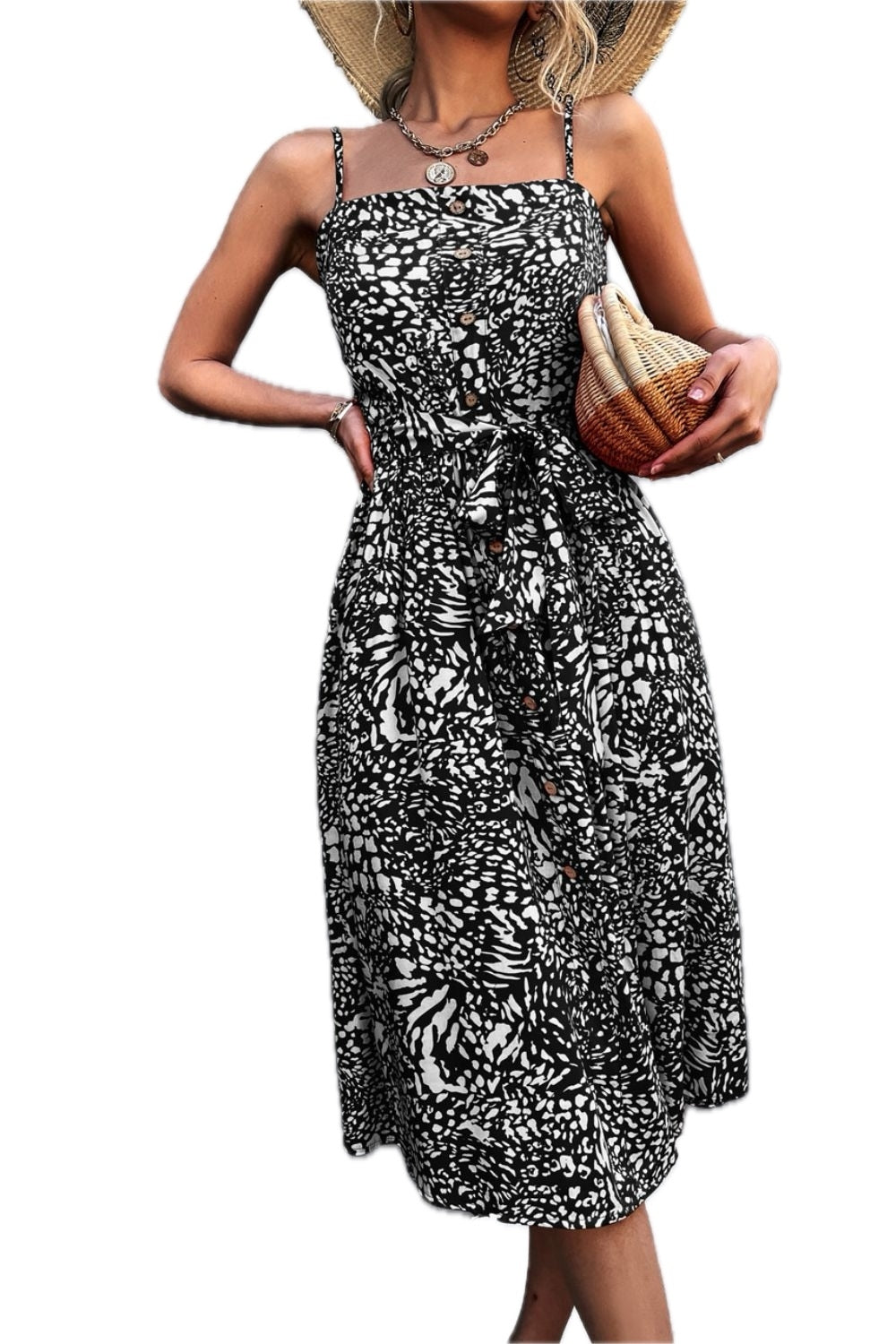 Women's Printed Spaghetti Strap Midi Dress with Decorative Button Belted Tie Neckline 95% polyester 5% spandex Casual