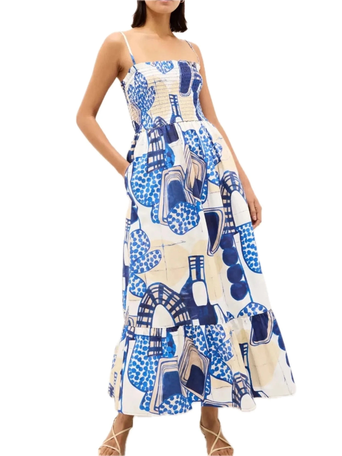 Women's Printed Square Neck Cami Midi Dress with Tiered Smocked Details and Slight Stretch in Polyester % Fabric