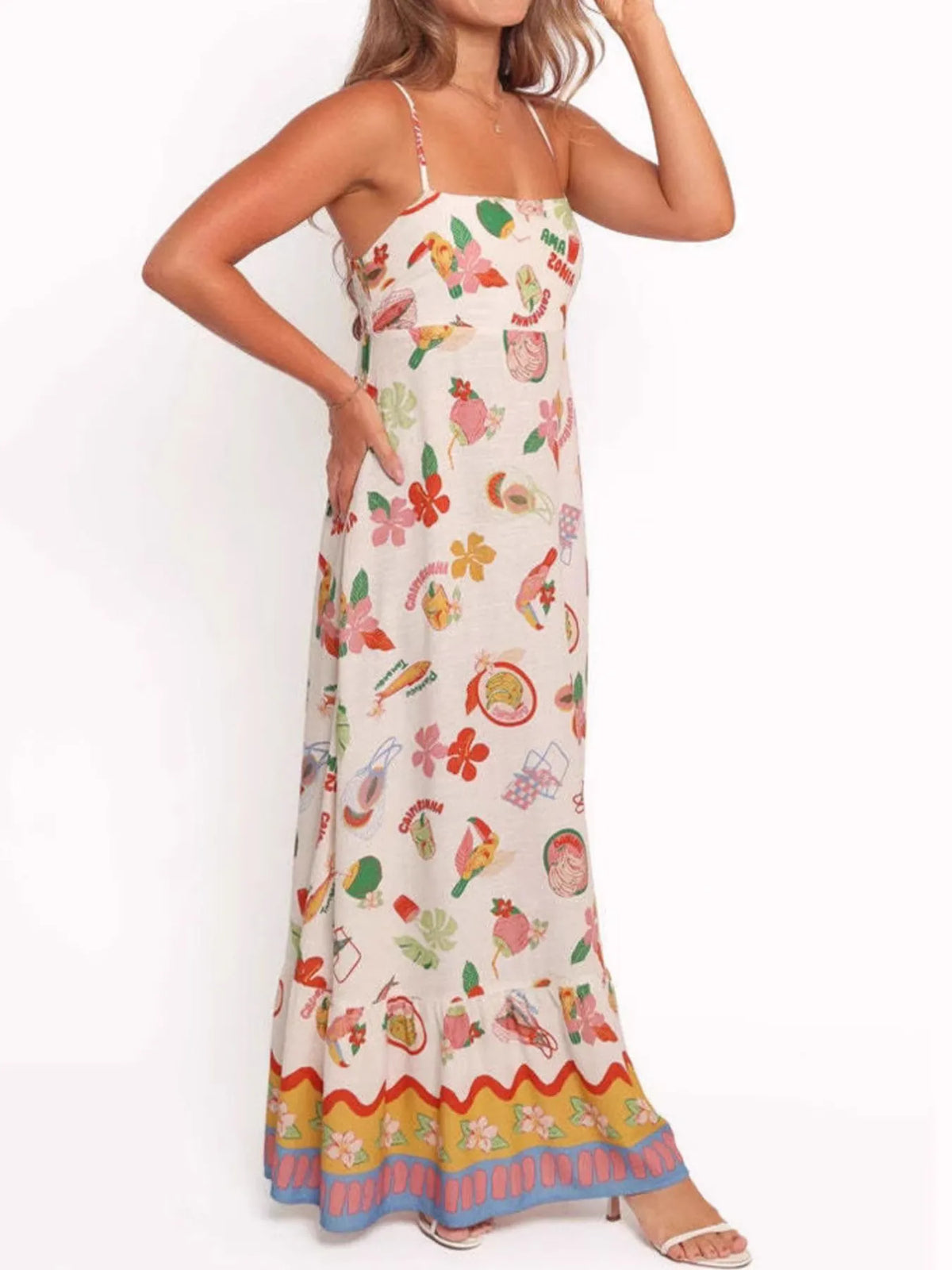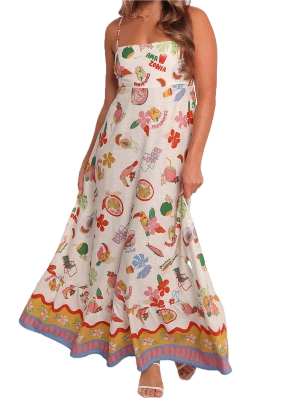 Women's Printed Square Neck Maxi Cami Dress with Tiered Ruffles and Slightly Stretchy Bodice Polyester % Fabric