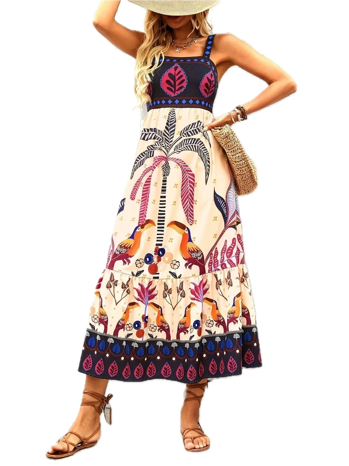 Womens Printed Square Neck Midi Dress with Tiered Stretch Bodice 95% polyester 5% spandex for Everyday Wear Casual Look