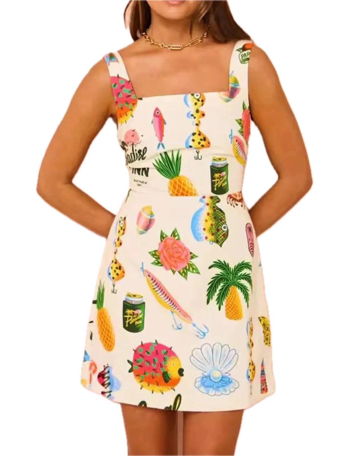 Women's Printed Square Neck Summer Mini Dress with Polyester % Fabric Unlined and Non Stretch for Casual Daily Wear