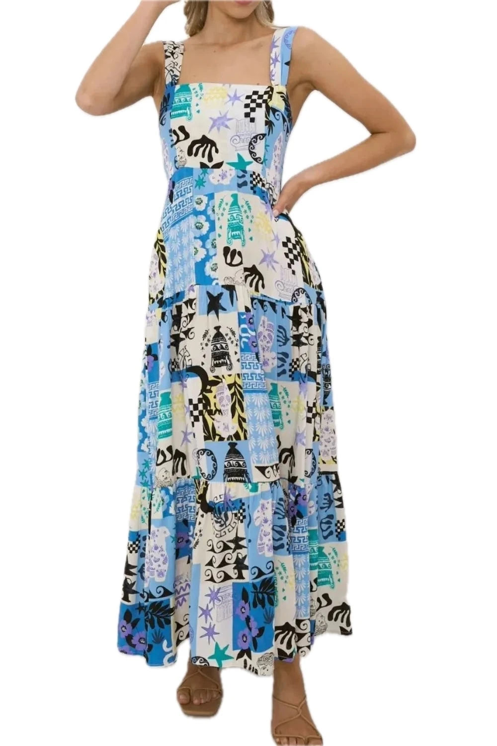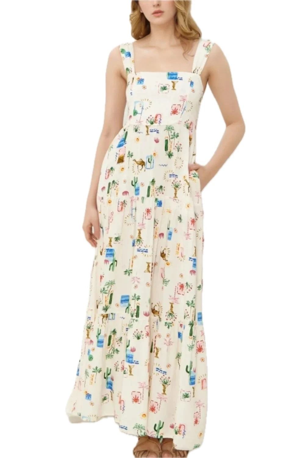 Women's Printed Square Neck Wide Strap Maxi Dress with Tiered Silhouette and Tie Detail 60% Polyester for Summer Events