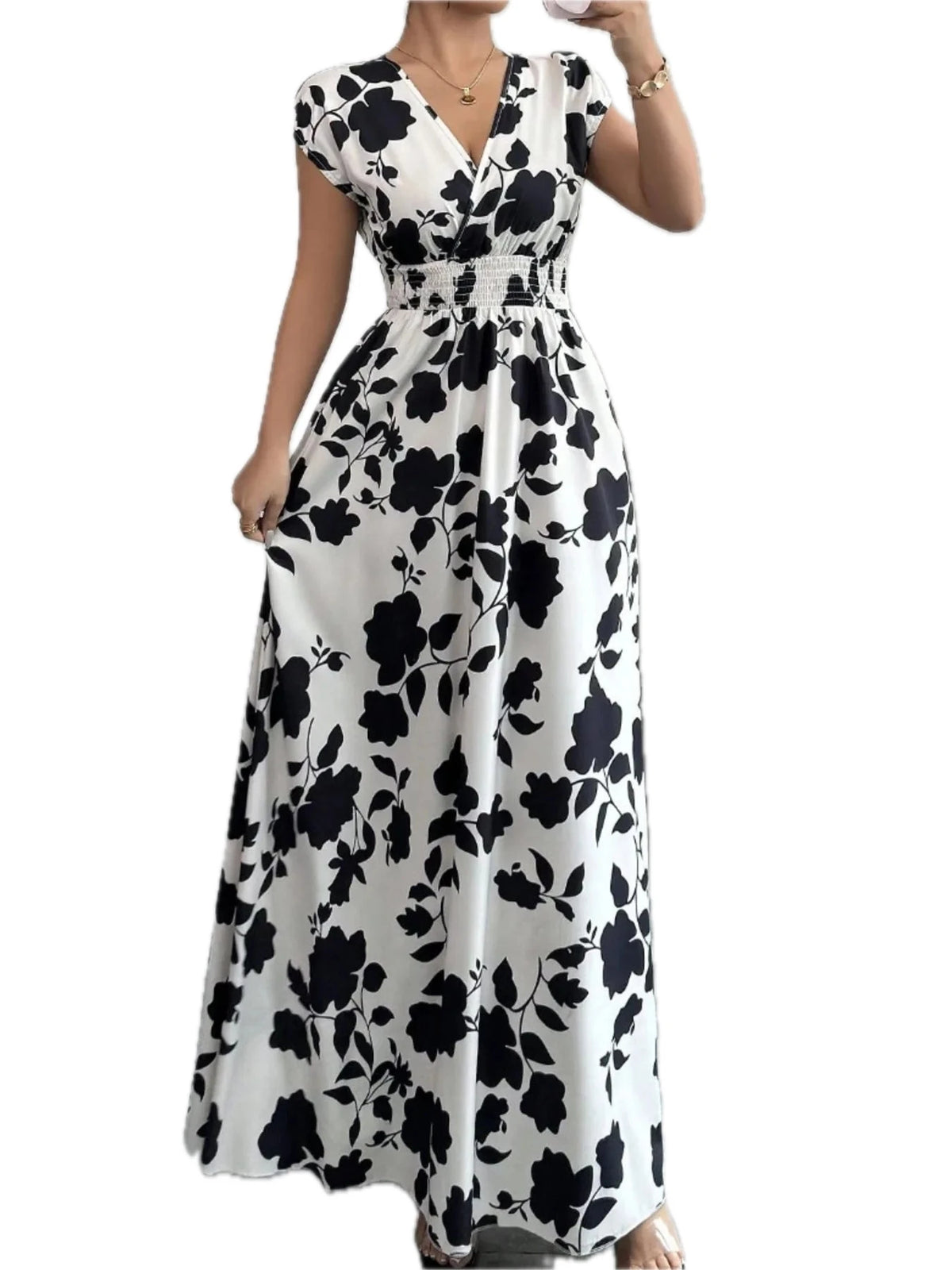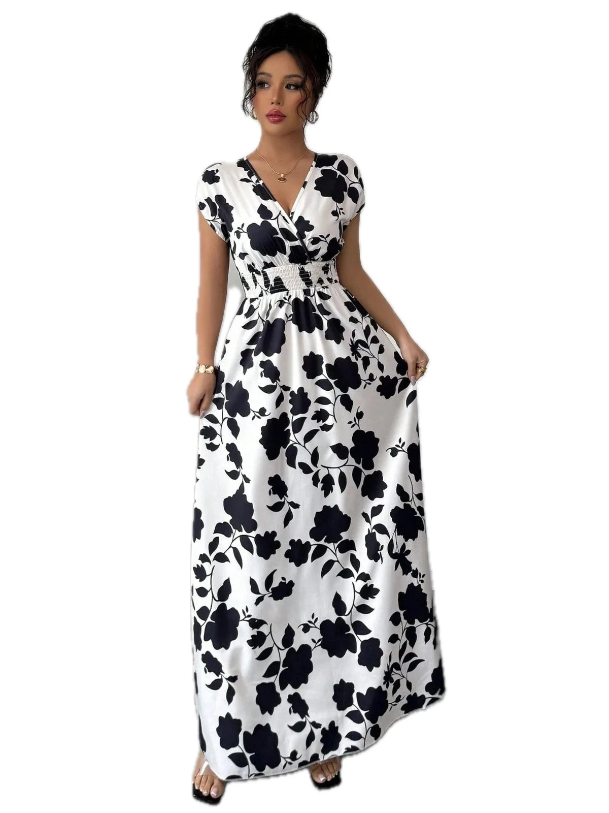 Women's Printed Surplice Cap Sleeve Maxi Dress with Flowing Skirt 100% Polyester Perfect for Day Wear and Travel