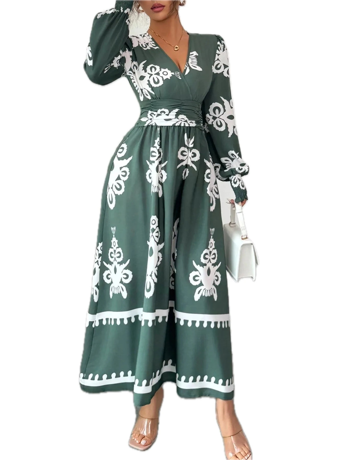 Women's Printed Surplice Lantern Sleeve Dress with Ruched Stretch Polyester Fabric for Everyday Formal Casual Wear
