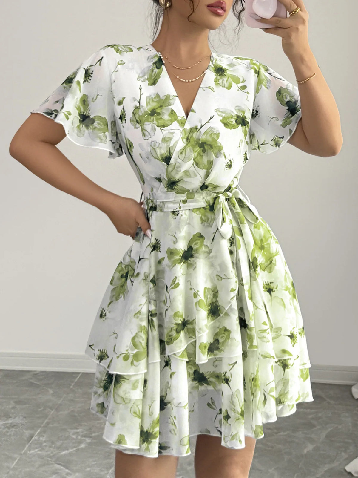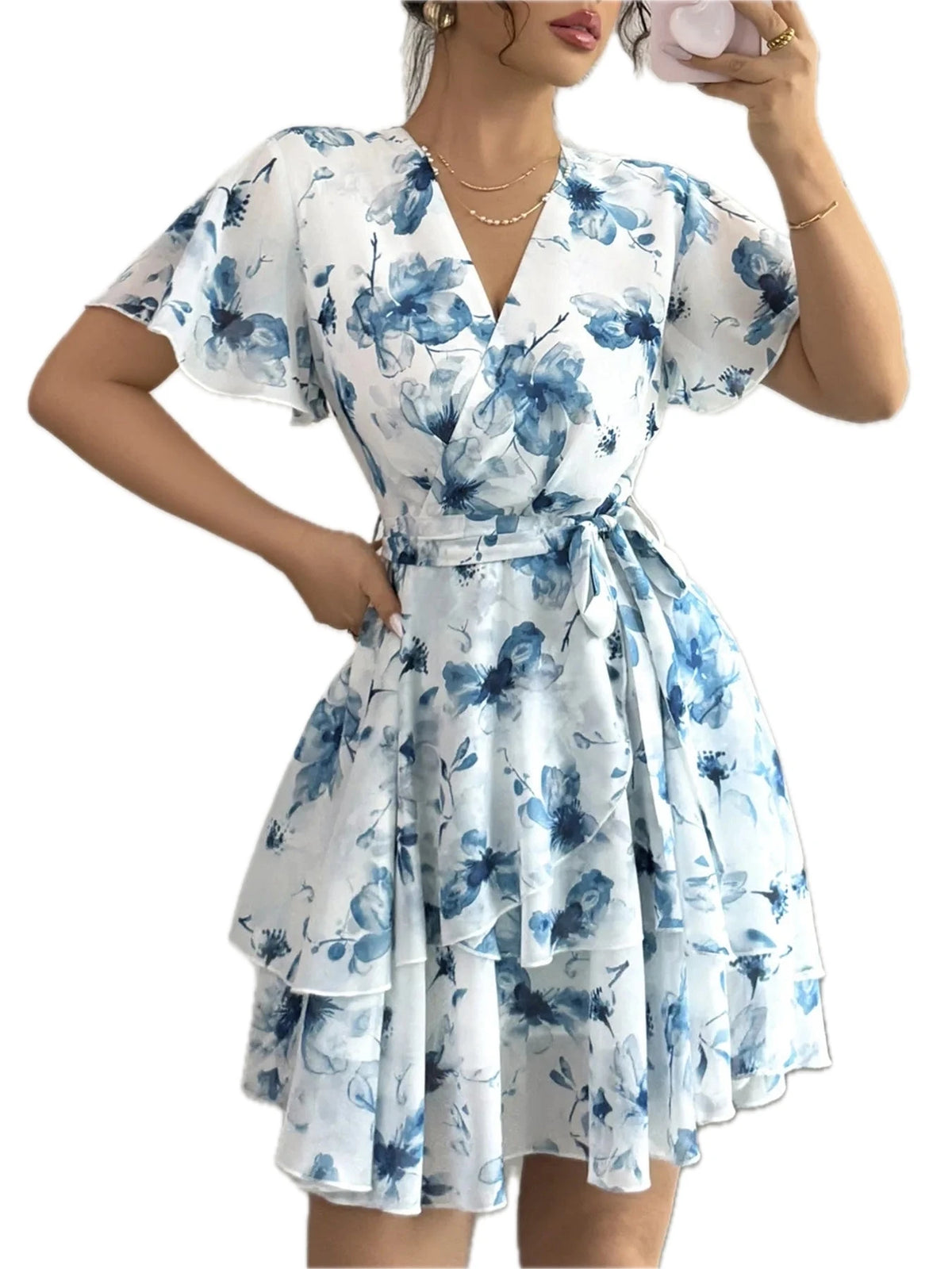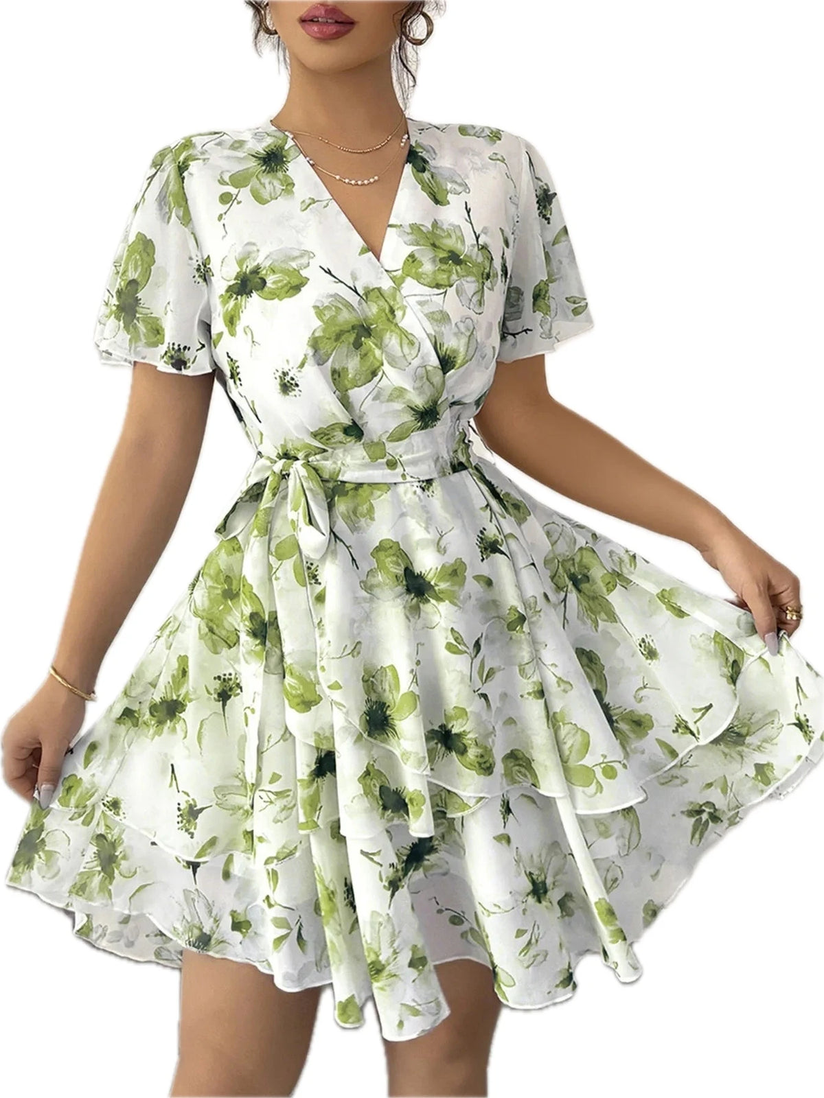 Women's Printed Surplice Layered Mini Dress with Ties and Ruffles Tiered Design 100% Polyester Fabric for Everyday Wear