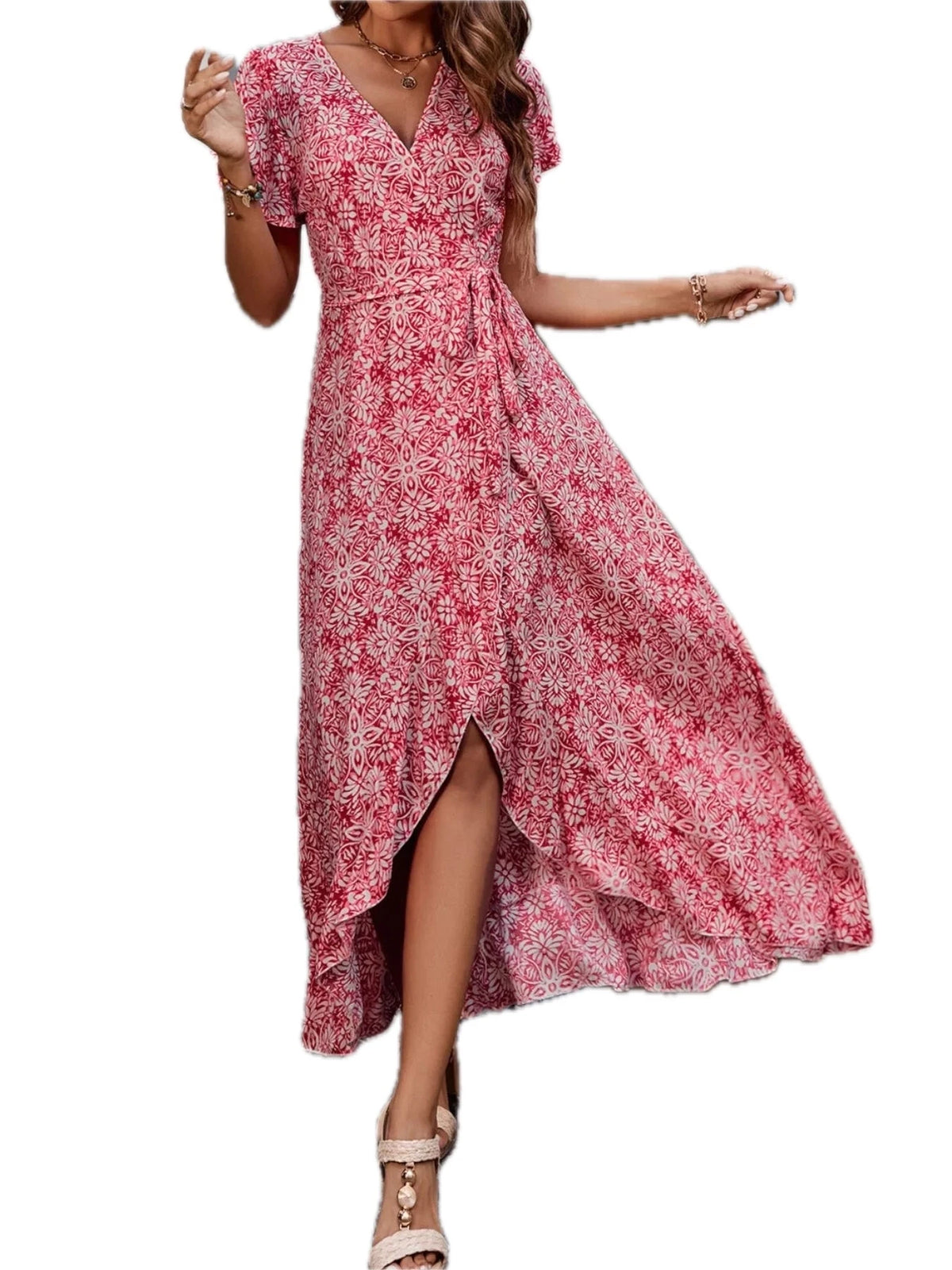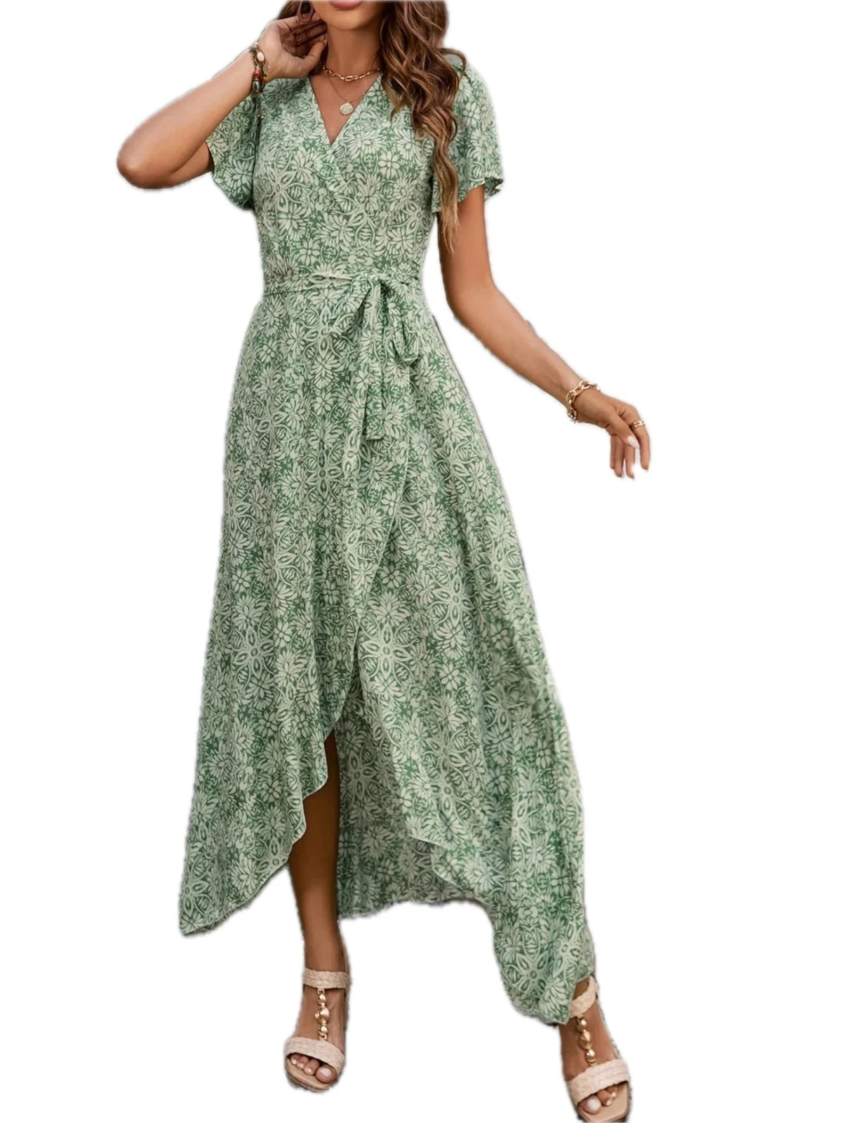 Women's Printed Surplice Maxi Dress with Flutter Sleeves Ruffle Trim Lightweight Polyester 100% Comfortable Wear