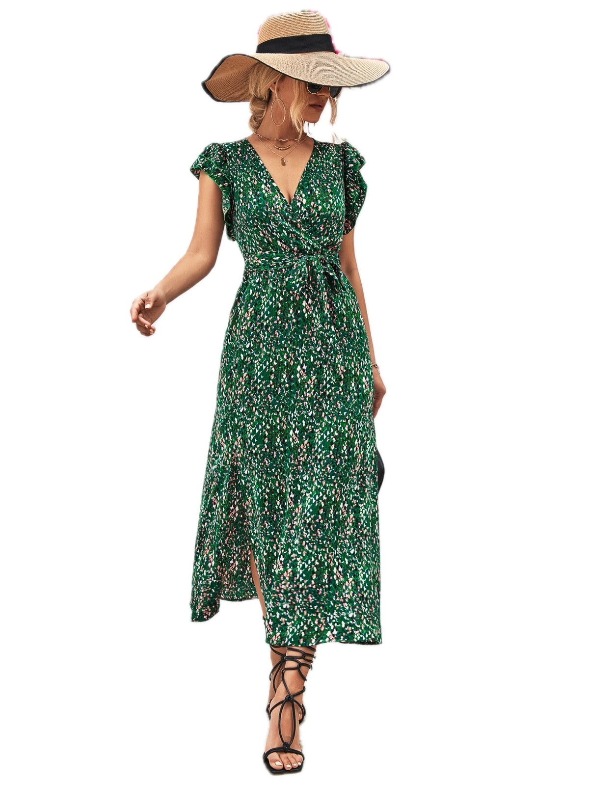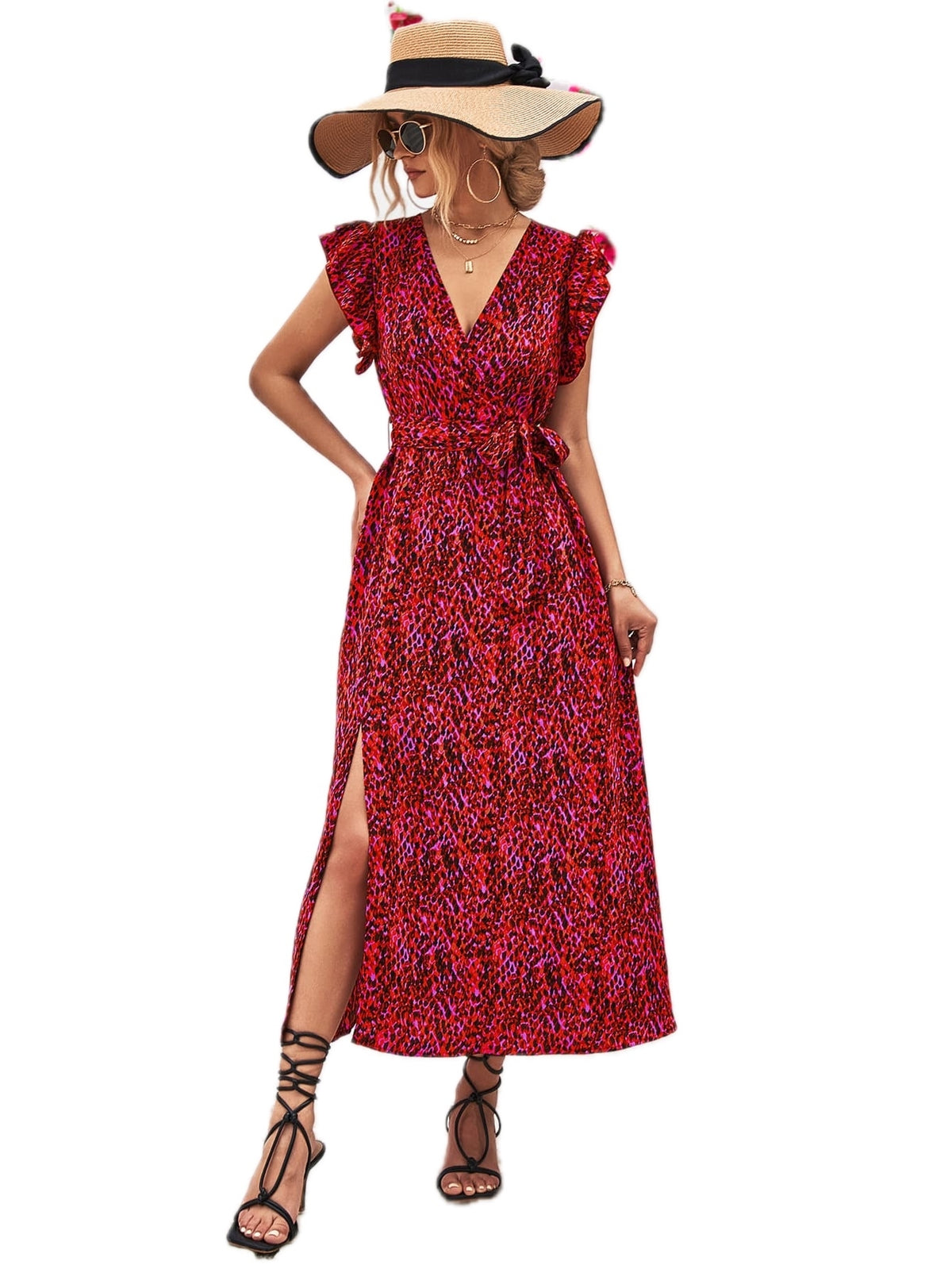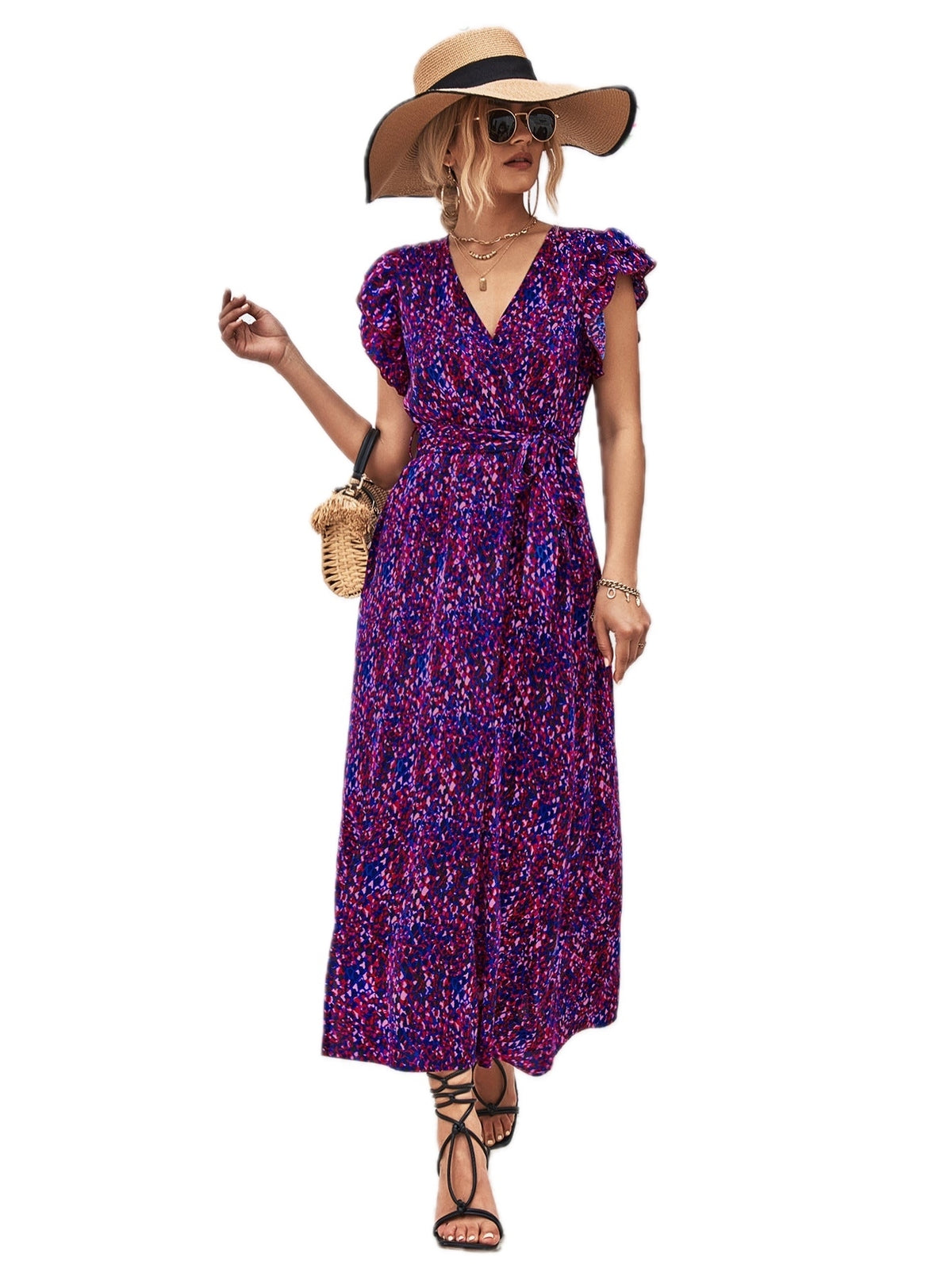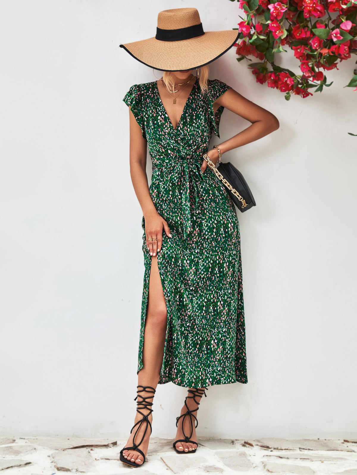 Women's Printed Surplice Neck Flutter Sleeve Midi Dress with Belted Waist and Slit 95% polyester 5% spandex daily