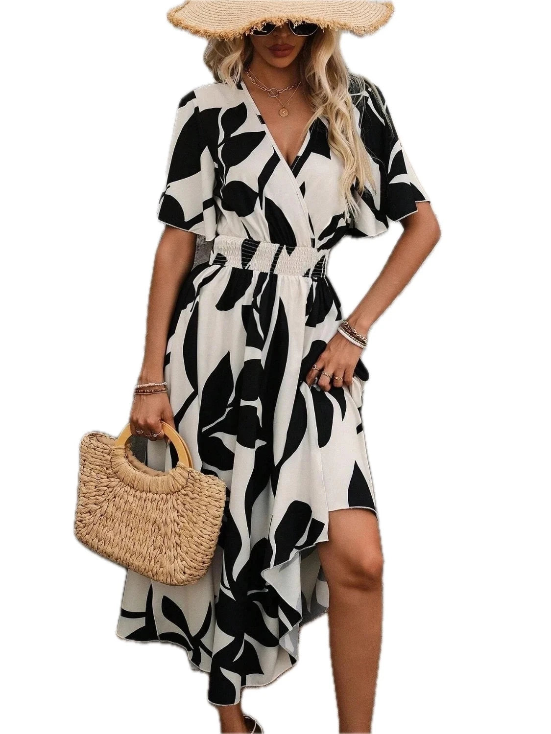 Women's Printed Surplice Short Sleeve Midi Dress 100% Polyester Fabric with Smocked Bodice and Flattering Silhouette