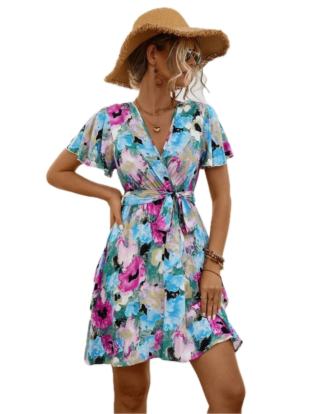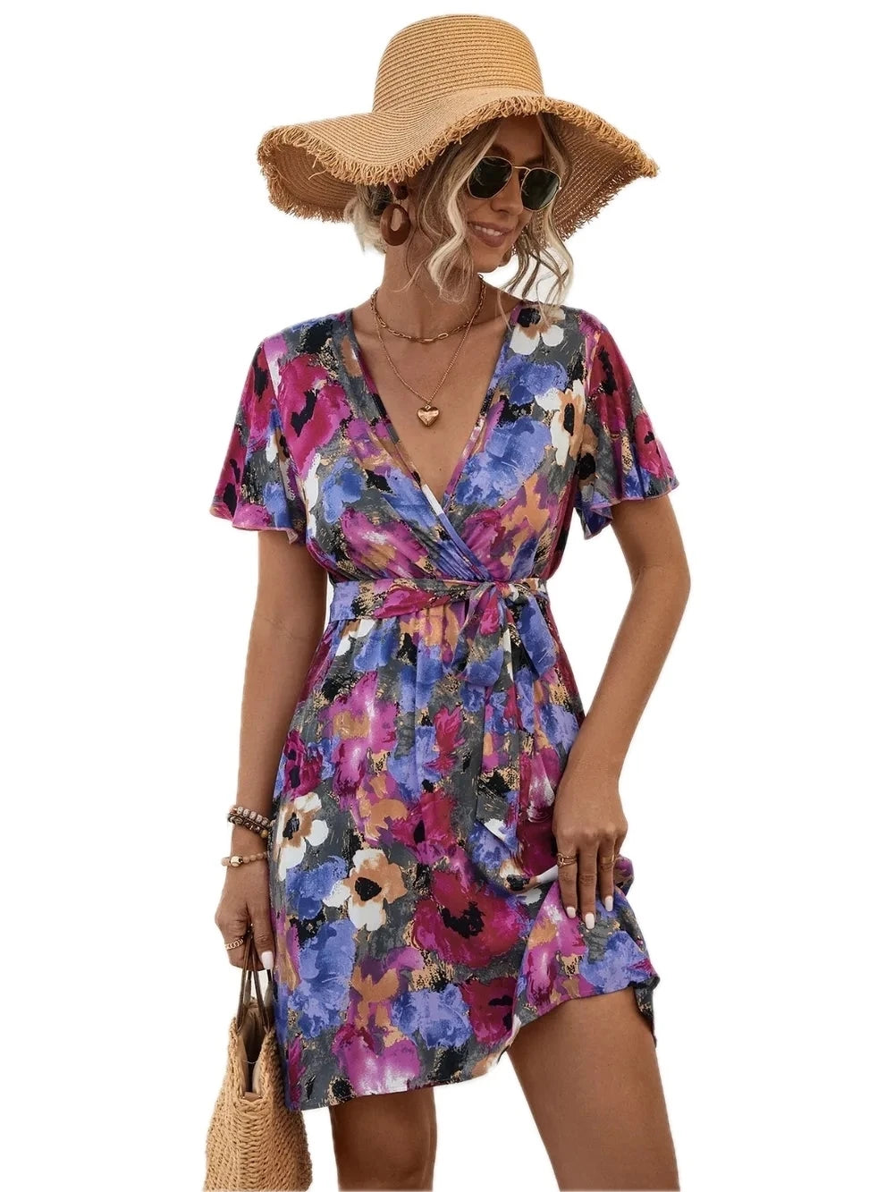 Women's Printed Surplice Tie Waist Mini Dress 95% polyester 5% elastane Elegant Sheer Detail Day to Night Everyday