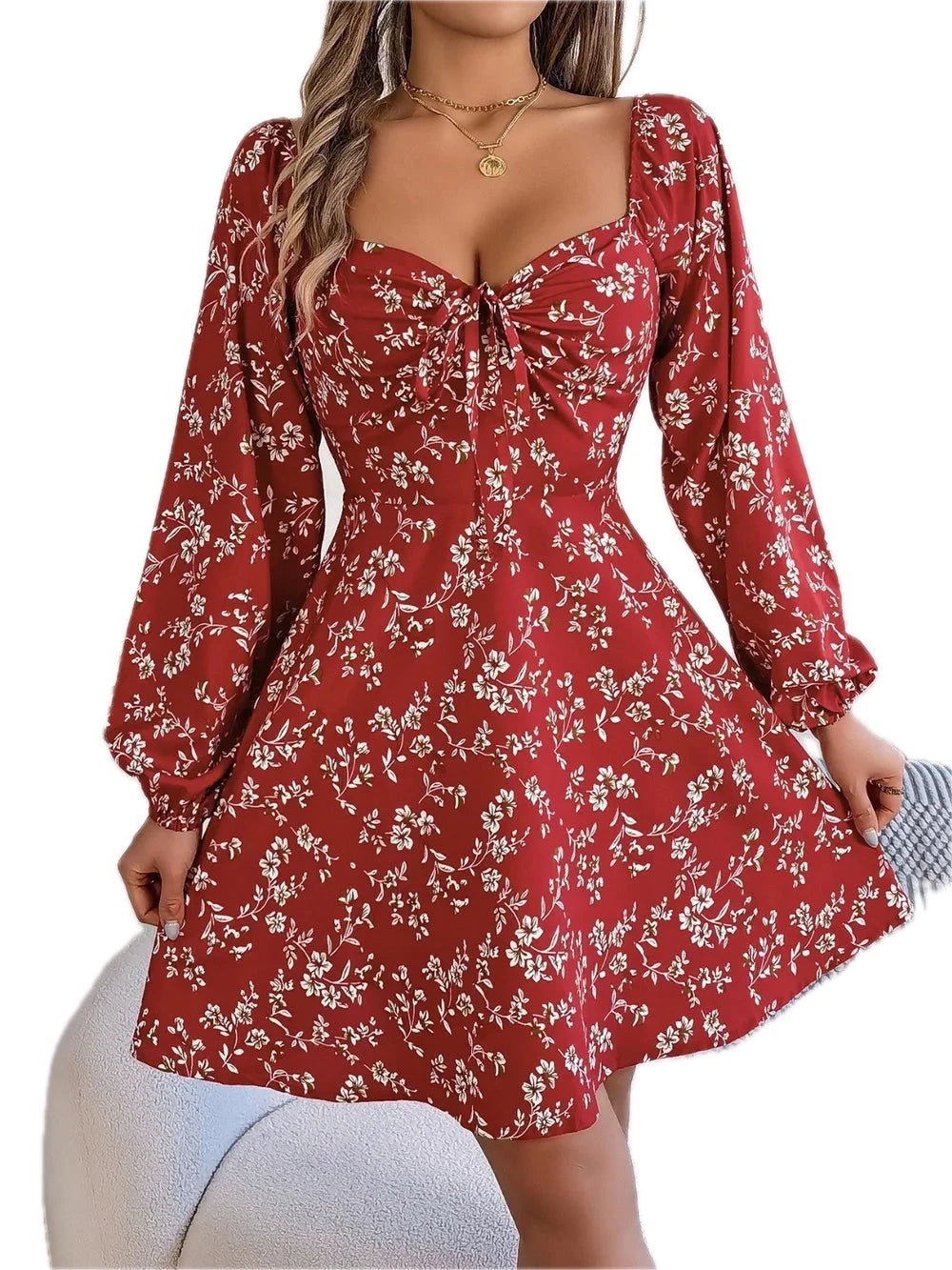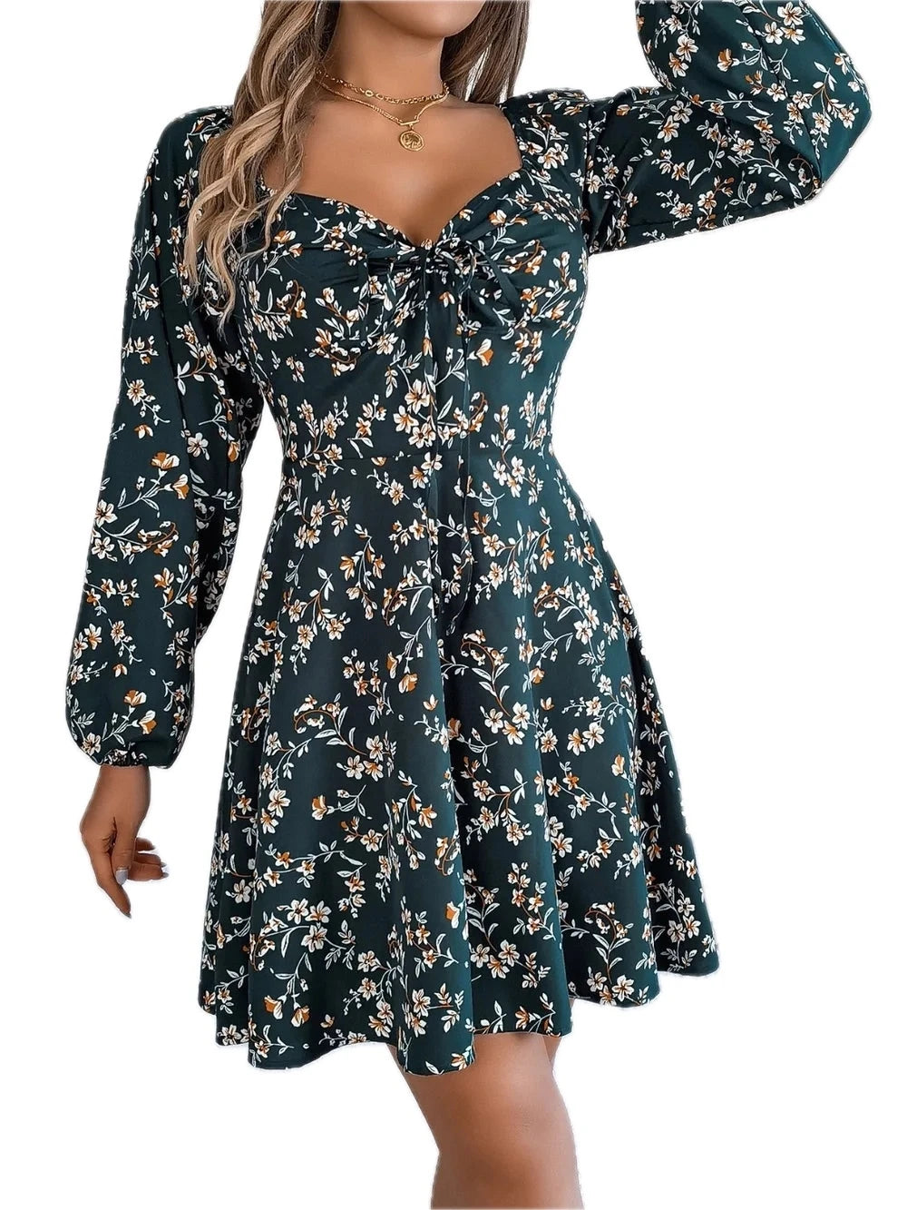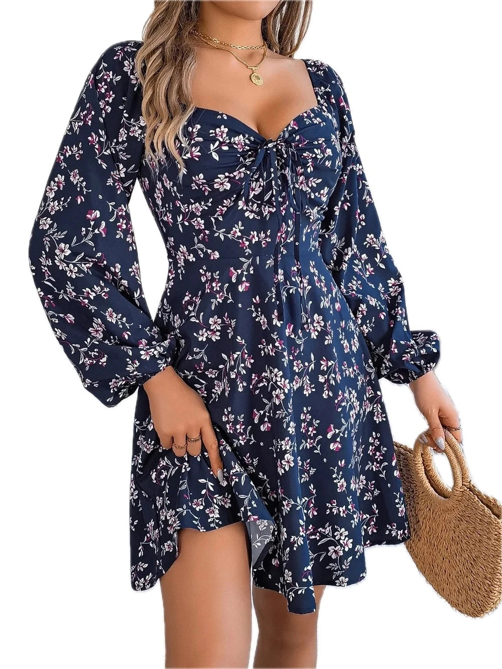 Women's Printed Sweetheart Neck Balloon Sleeve Mini Dress 100% Polyester Lightweight Everyday Summer Casual Chic Dress