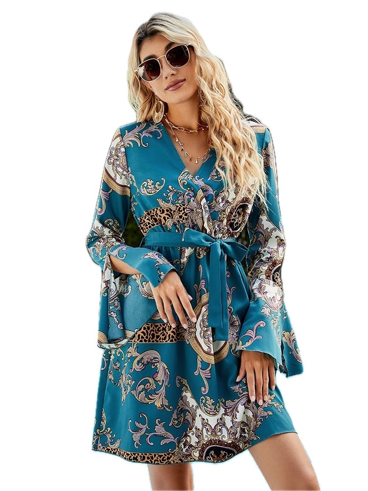 Women's Printed Tie Belt Slit Flare Sleeve Dress with Surplice Neckline and 100% polyester fabric for chic occasions
