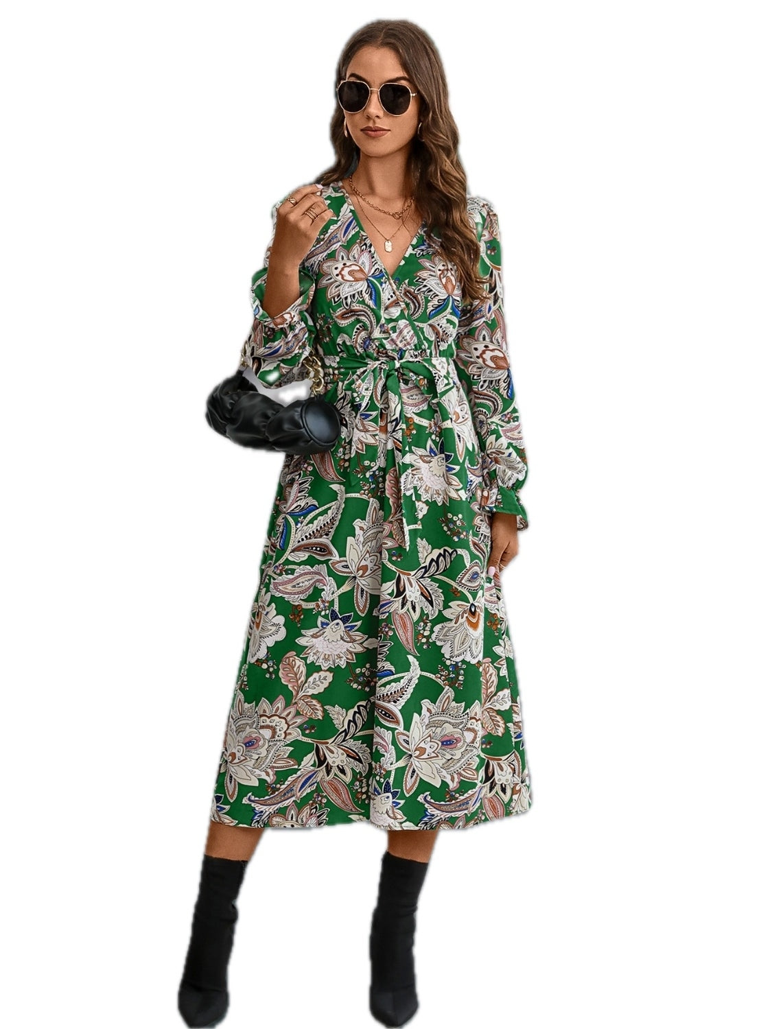 Women's Printed Tie Front Surplice Flounce Sleeve Dress Ninety Five Percent Polyester and Five Percent Elastane