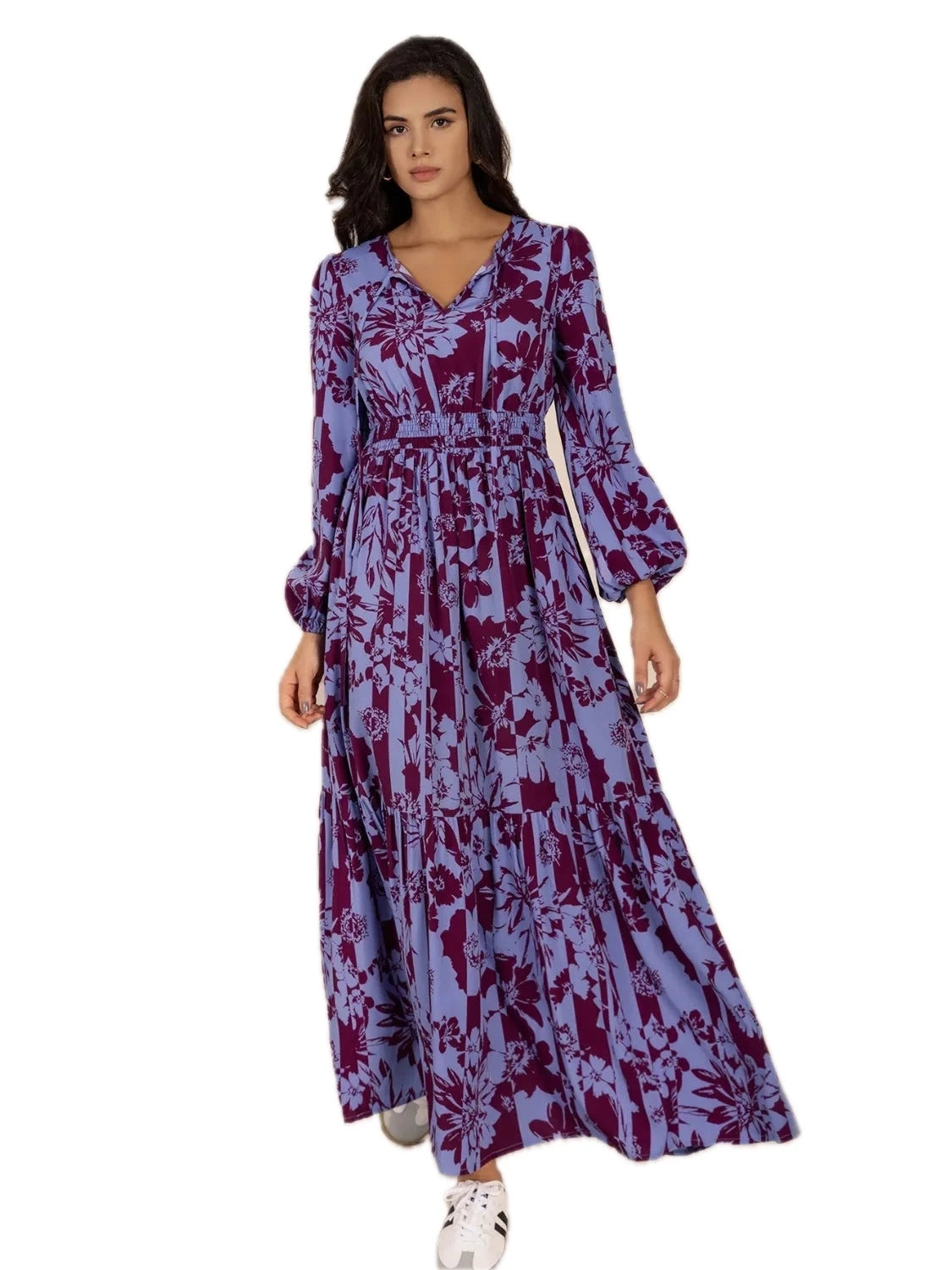 Women's Printed Tie Neck Balloon Sleeve Maxi Dress in Polyester % Fabric for Elegant Everyday Wear for every occasion
