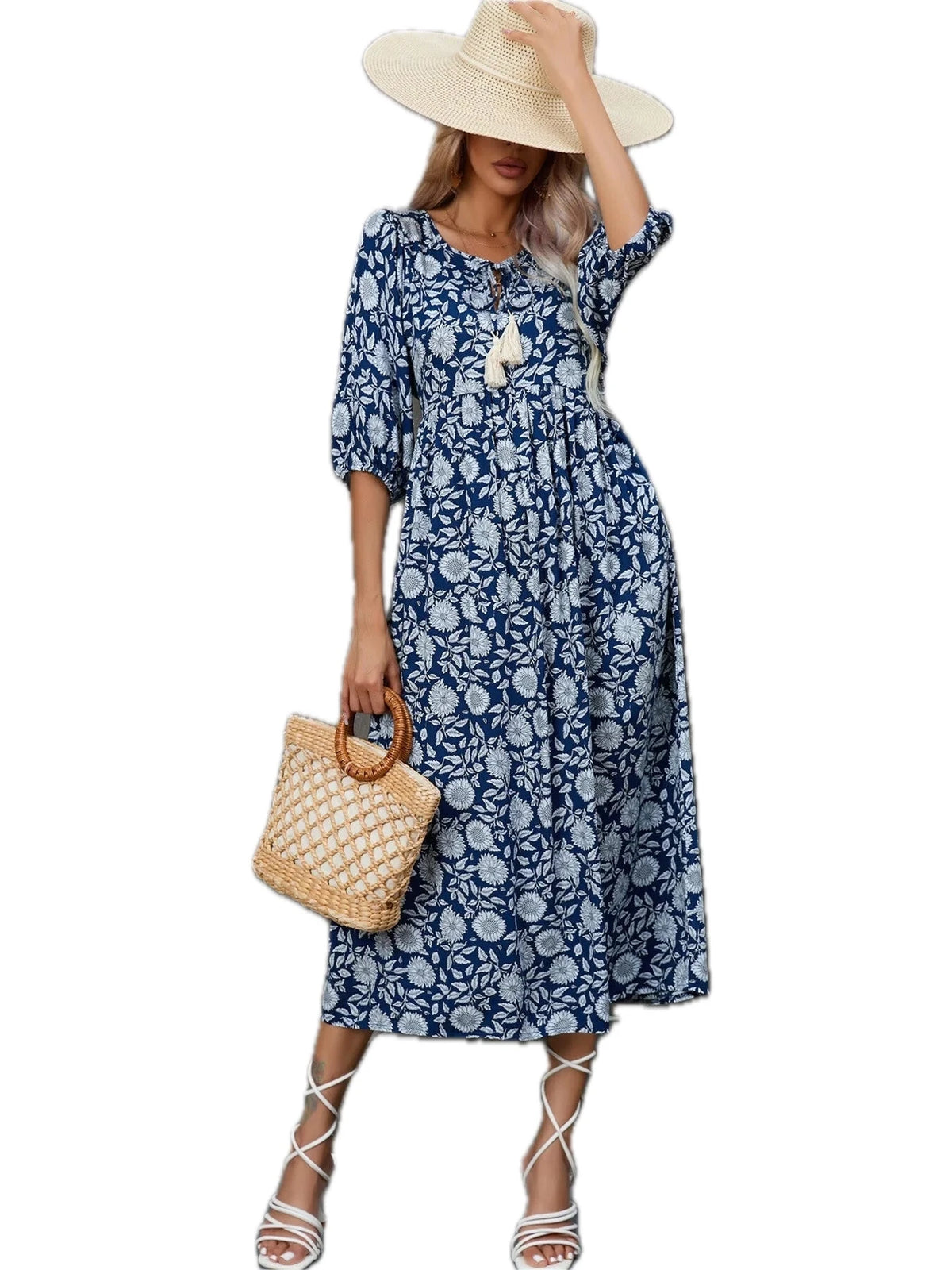 Women's Printed Tie Neck Midi Dress with Ruched Bodice and Tassel Details 100% Cotton Fabric for Everyday Wear Today