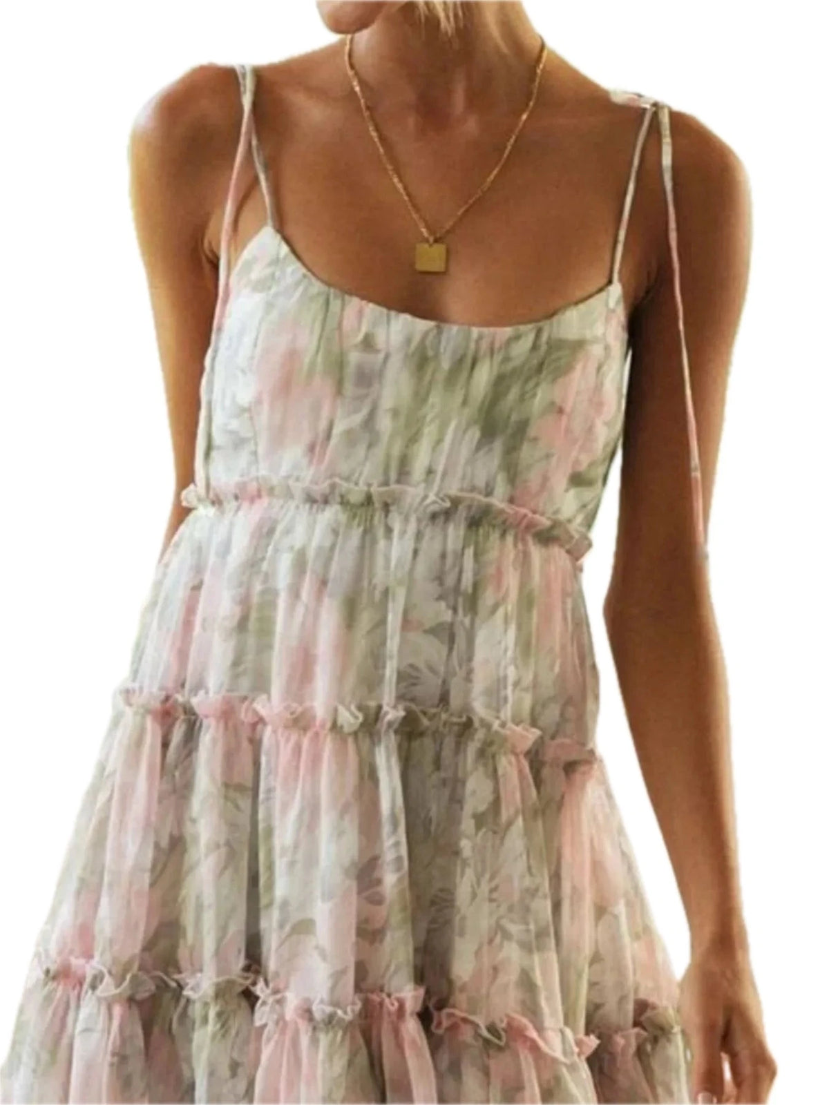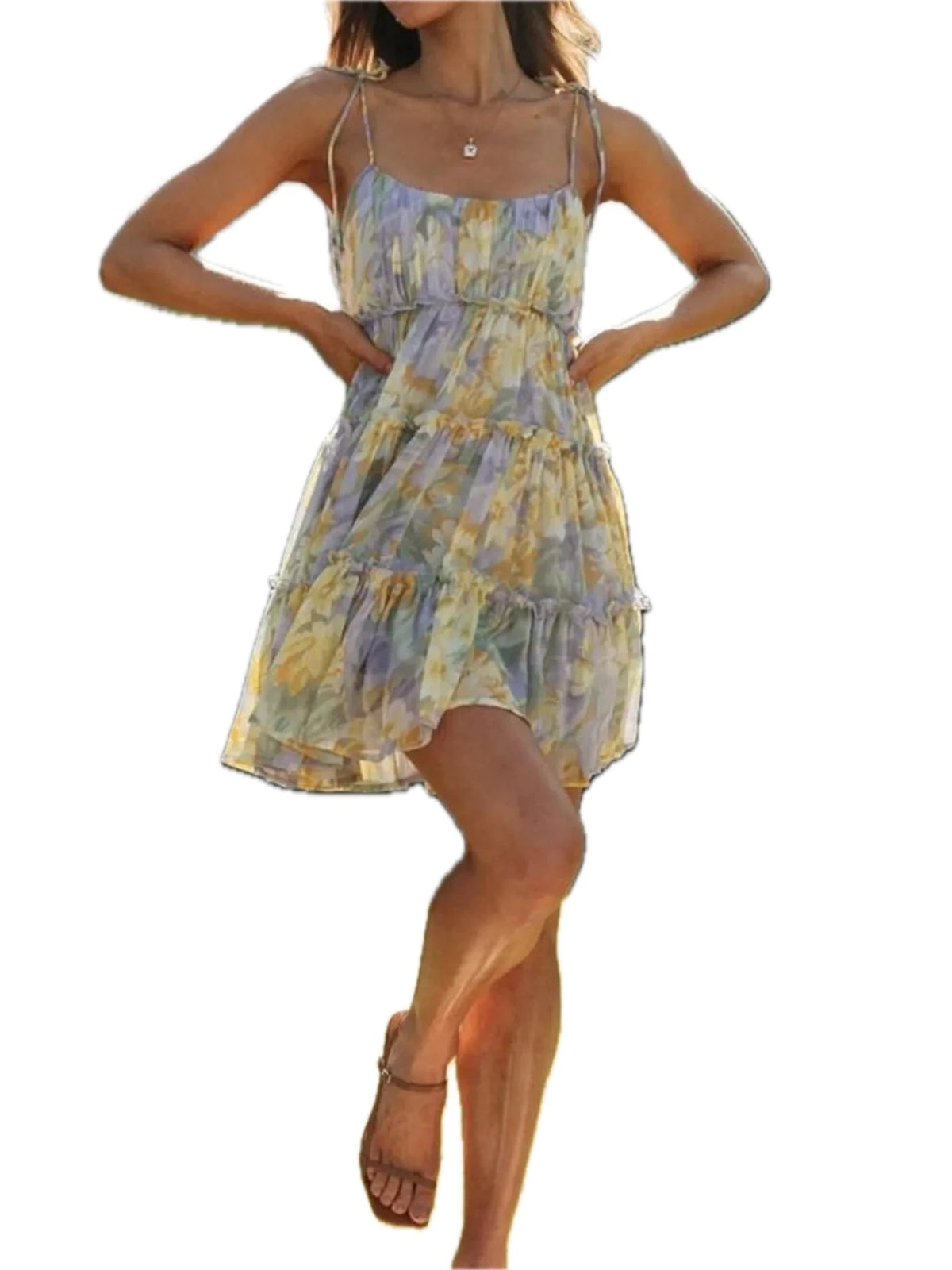 Women's Printed Tie Strap Tiered Mini Dress with Frill Smocked Details Lined for Comfort 100% Polyester Fabric