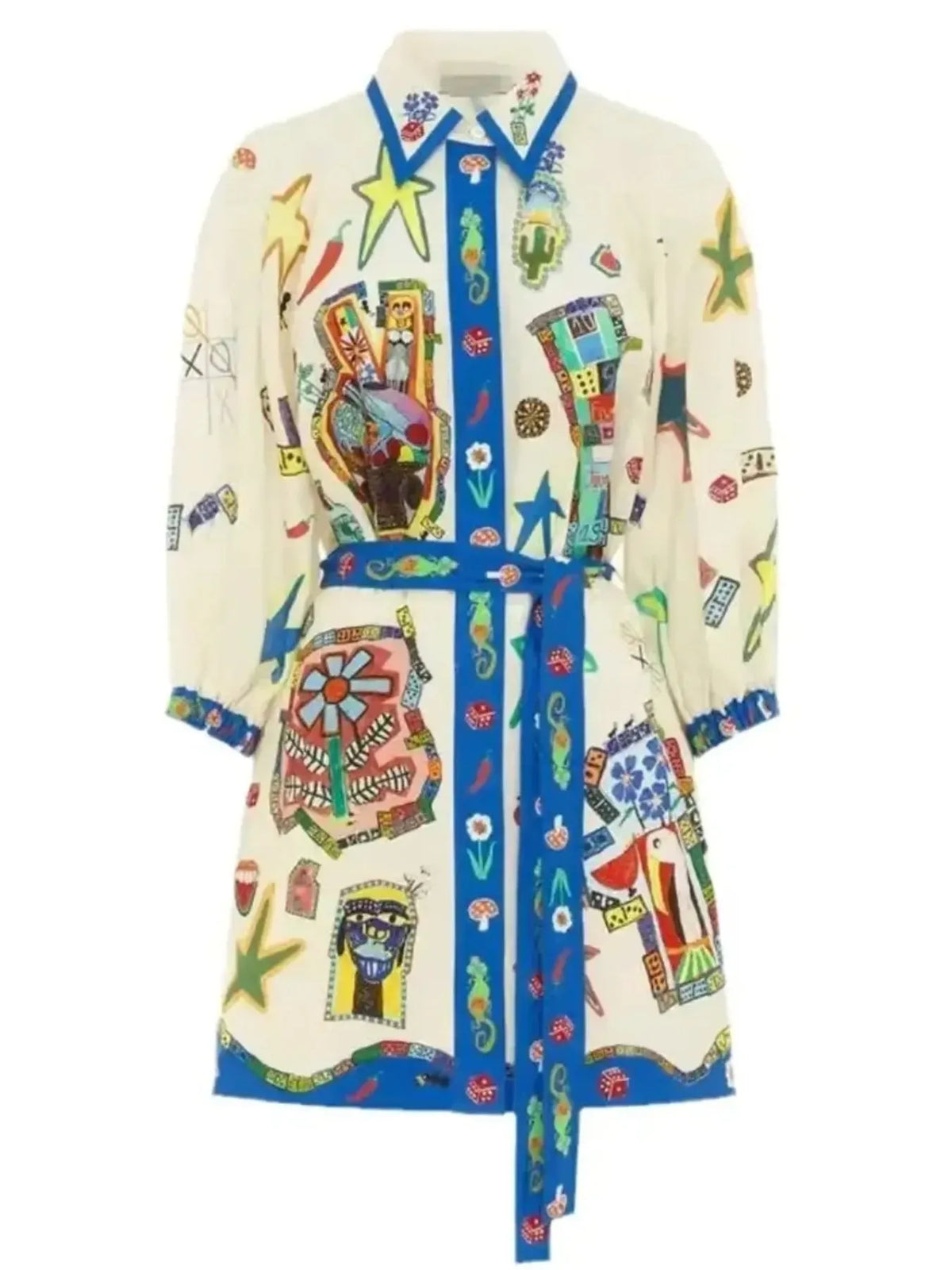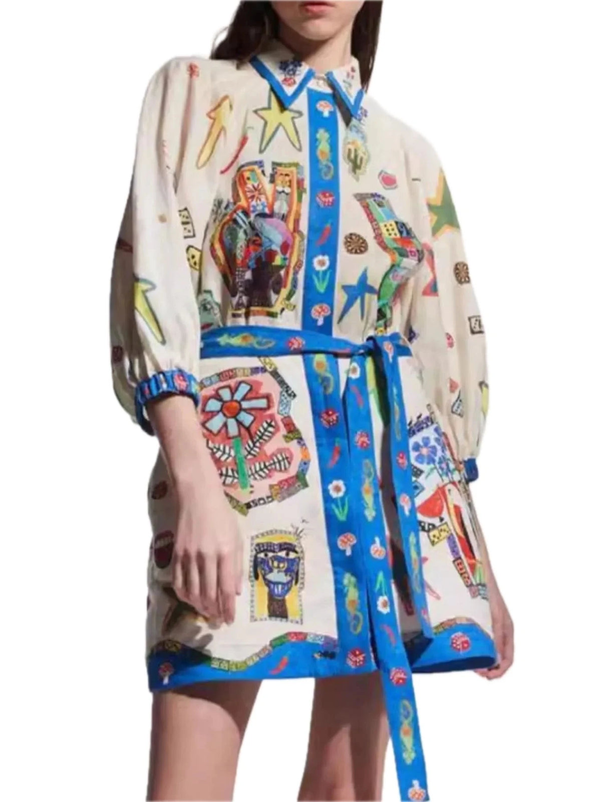 Women's Printed Tie Waist Mini Shirt Dress with Belted Front Button Details Polyester % Fabric with lightweight drape