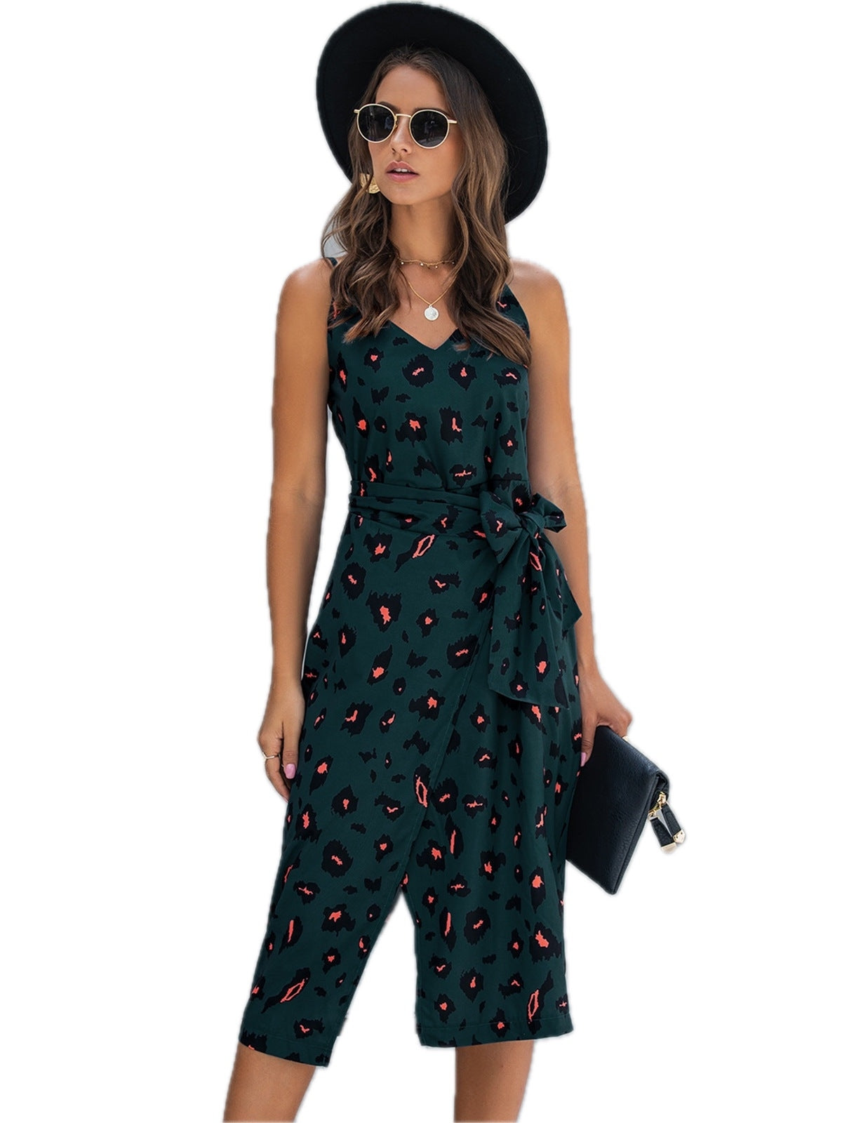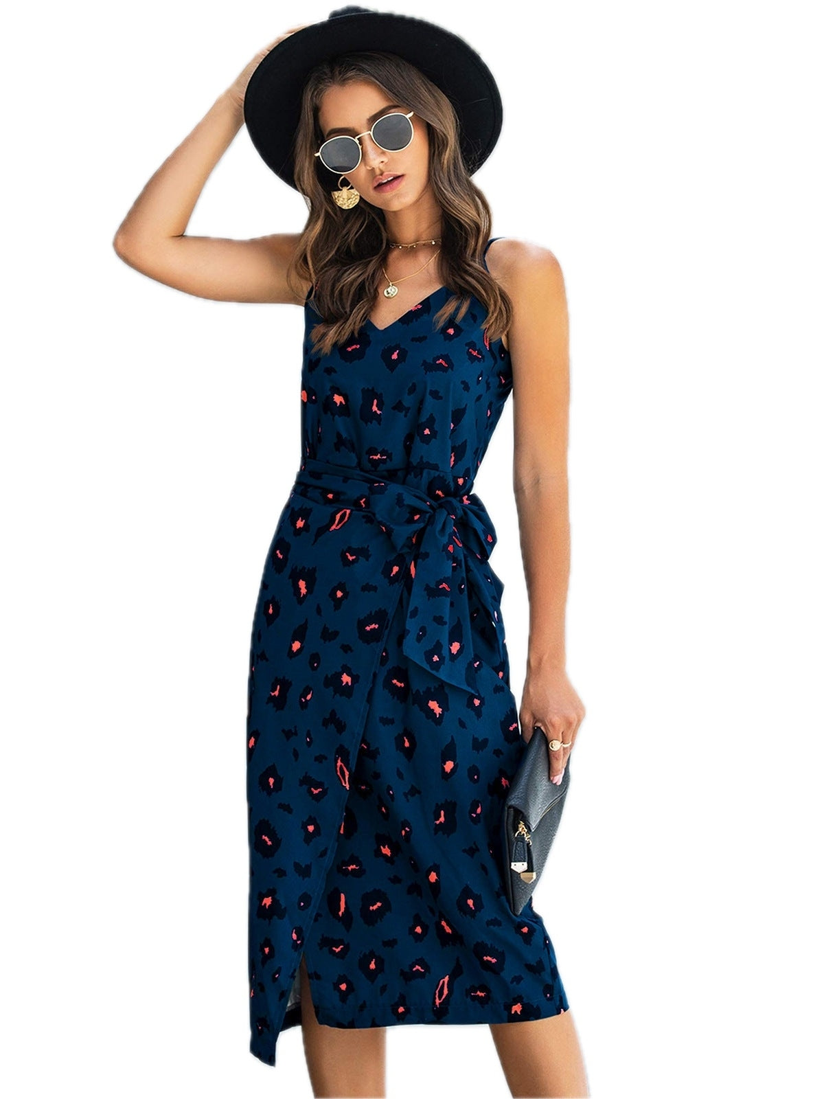 Women's Printed Tie Waist Spaghetti Strap Midi Dress with V neck Sleeveless Silhouette 100% Polyester Casual Chic