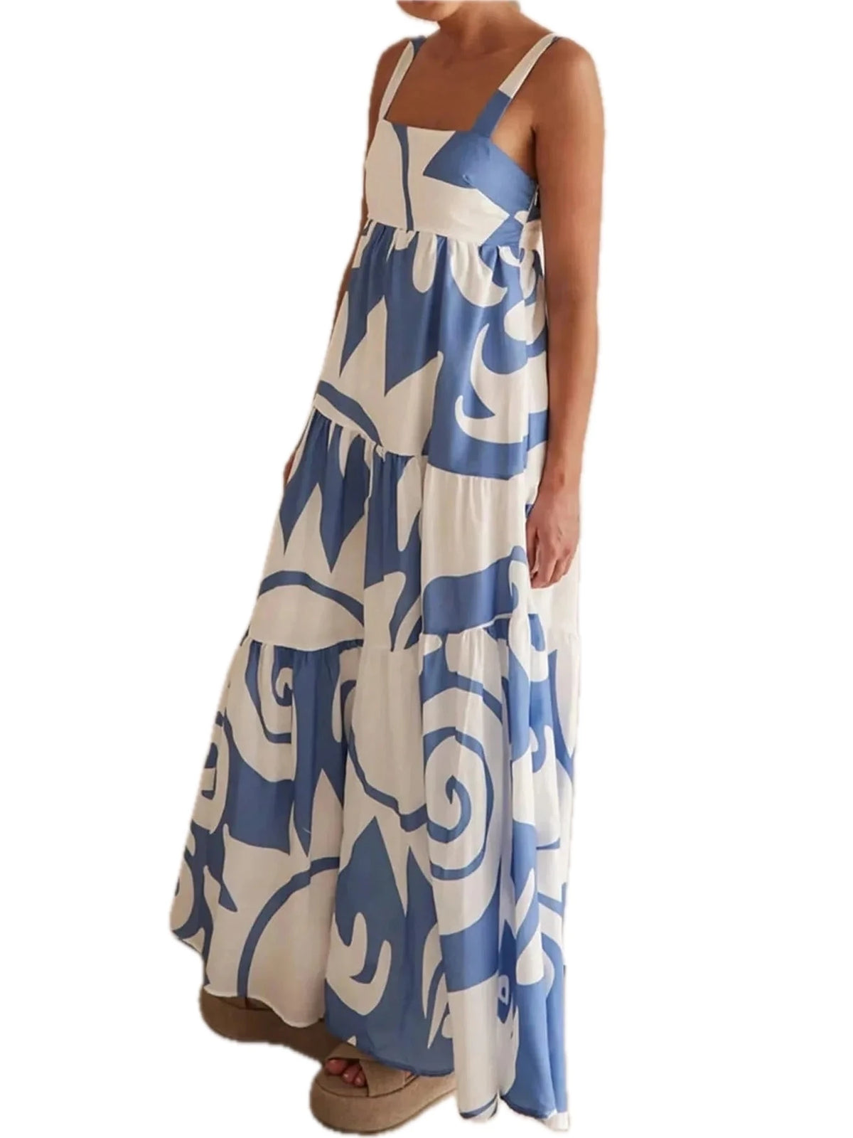 Women's Printed Tiered Square Neck Maxi Dress 100% Polyester Fabric Flattering Silhouette Ideal for Summer Events