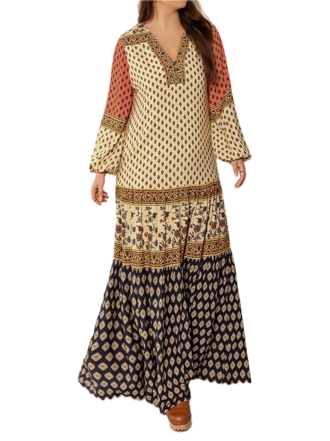 Women's Printed V Neck Balloon Sleeve Maxi Dress with Ruched Detail and Flowing Silhouette 100% Polyester Fabric