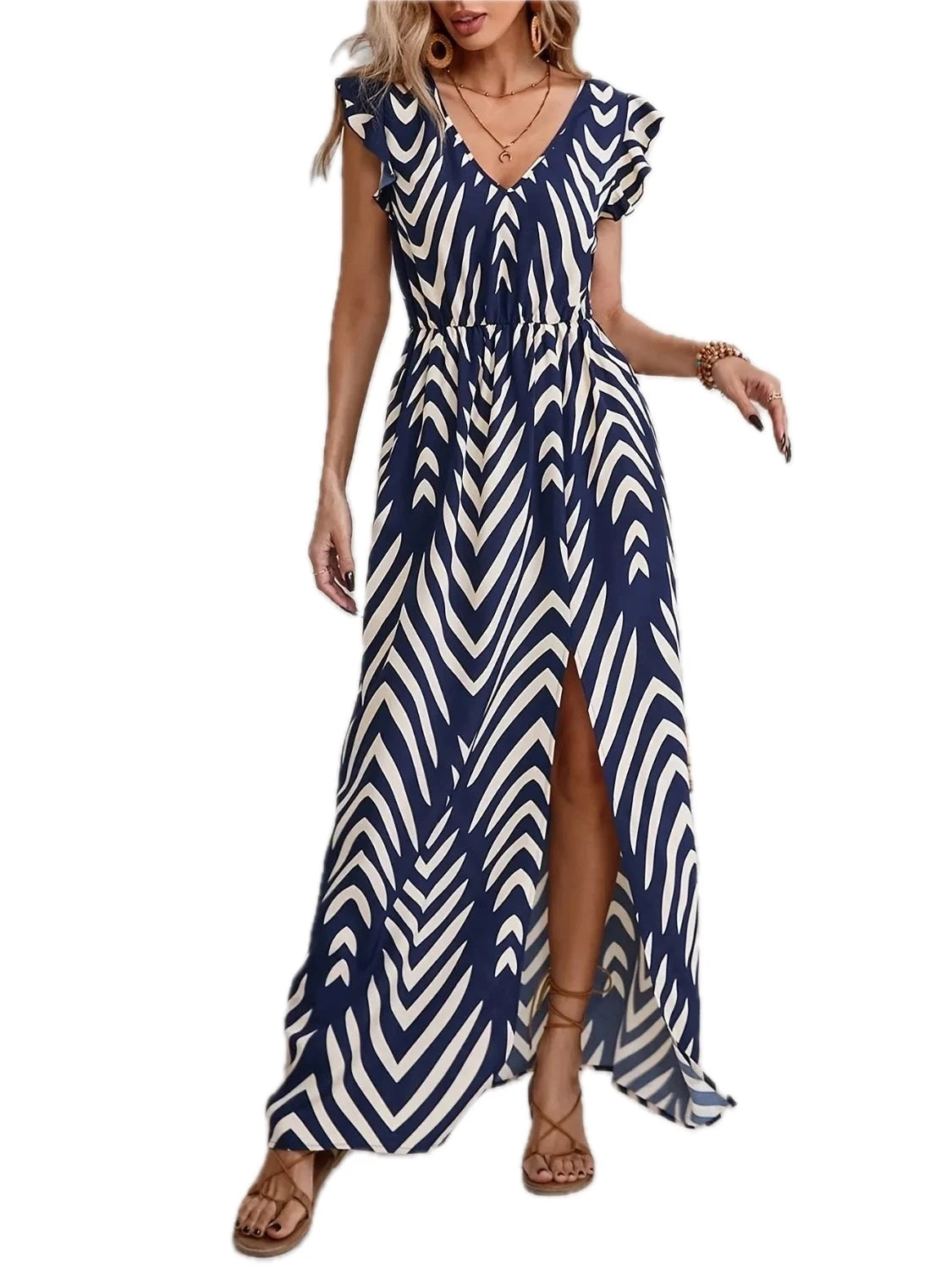 Women's Printed V Neck Cap Sleeve Maxi Dress with Split and Ruffle Details 100% Polyester Everyday Wear Travel Ready