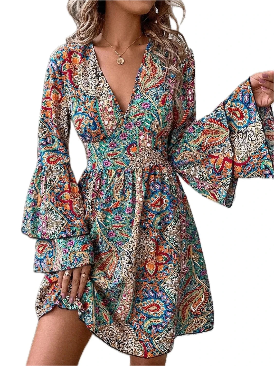 Women's Printed V Neck Flounce Sleeve Dress with polyester fabric perfect for Everyday Wear Easy Care Lightweight