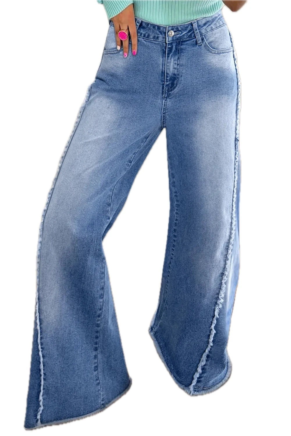 Womens Wide Leg Jeans with Raw Hem and Pockets Slightly Stretchy Denim High Waisted Casual Everyday Wear All Season