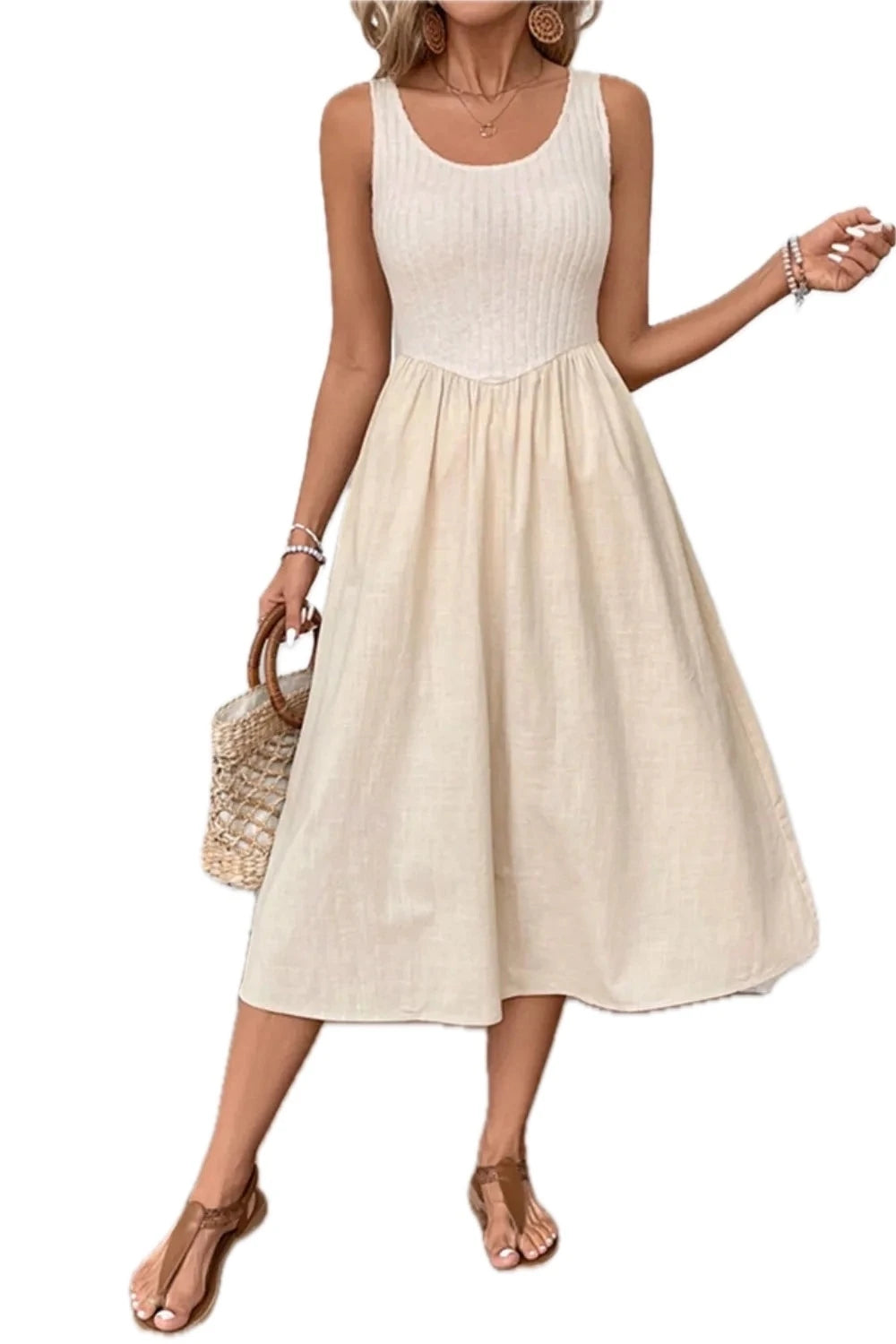 Women's Ribbed Bodice Sleeveless Midi Dress 100% Polyester Fabric Stretchy Lightweight Everyday Wear Easy Care Daily