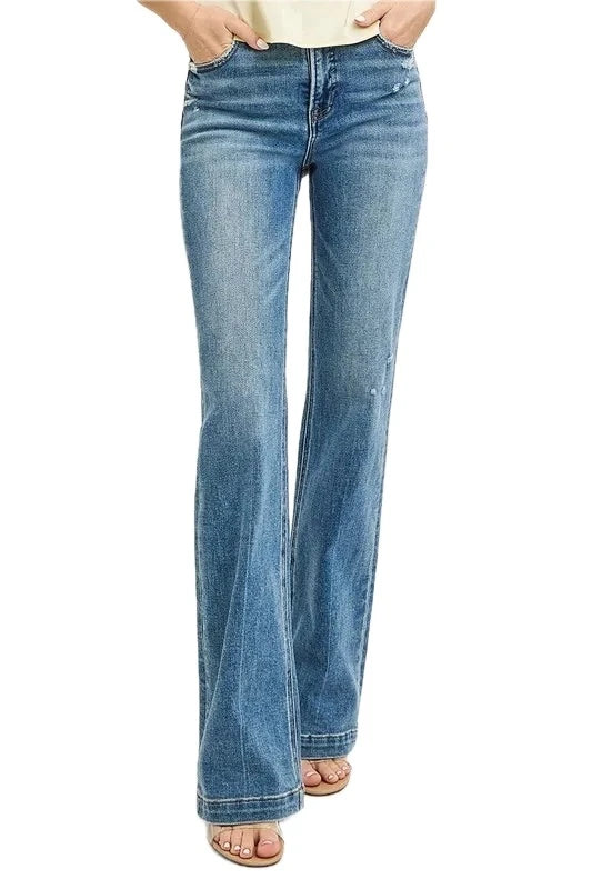 These classic blue boot-leg jeans create a flattering silhouette while offering a sleek vintage-inspired look. Made from high-quality stretch denim fabric for all-day comfort and a perfect fit on the hips and thighs. The mid-blue wash with a subtle fade gives them a versatile appeal and is suitable for both casual and semi-formal occasions. The traditional five-pocket construction and belt-loop waistband ensure classic jeans functionality, while the bootcut design makes them perfect for teaming with heels, boots or sandals. These jeans embody timeless denim craftsmanship and modern comfort technology.