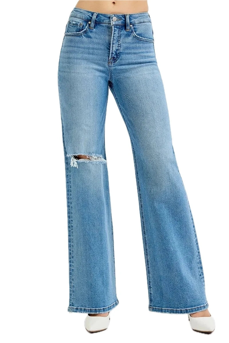 Womens Wide Leg Distressed Jeans Plus Size Light Blue Wash with Knee Detail and Button Zip Closure daily wear casual