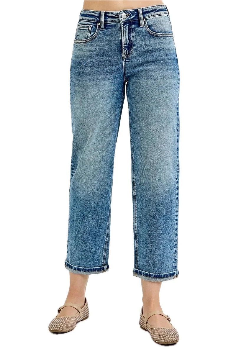 These RISEN Full Size High Rise Crop Boyfriend Jeans in Plus Size feature a vintage-inspired medium blue wash with a relaxed boyfriend fit. Crafted from premium cotton blend denim with stretch for comfort and durability. The high-rise waistline creates a flattering silhouette while the cropped length hits perfectly at the ankle. Button fly closure and classic five-pocket styling add authentic denim appeal. The loose, comfortable fit through the hip and thigh makes these perfect for casual everyday wear. Available in full size range including plus sizes for inclusive sizing. The faded wash and whiskering details give these jeans a lived-in vintage aesthetic that pairs perfectly with any casual outfit.