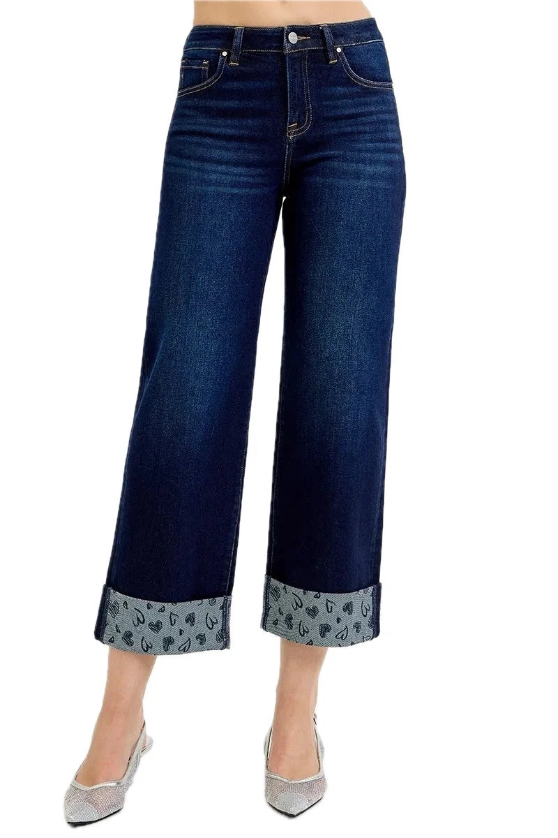 Womens Cropped Wide Leg Mid Rise Denim Jeans with Unique Printed Cuff Polka Dot Detail Plus Size Casual Five Pocket