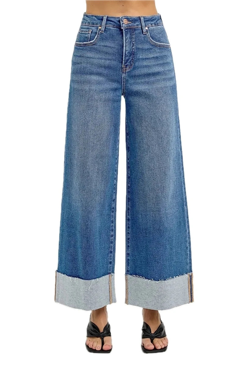 Women High Rise Crop Jeans with Wide Cuff and Raw Hem Pocketed Denim Pants Stretchy Fit for Plus Size Figure Flattering