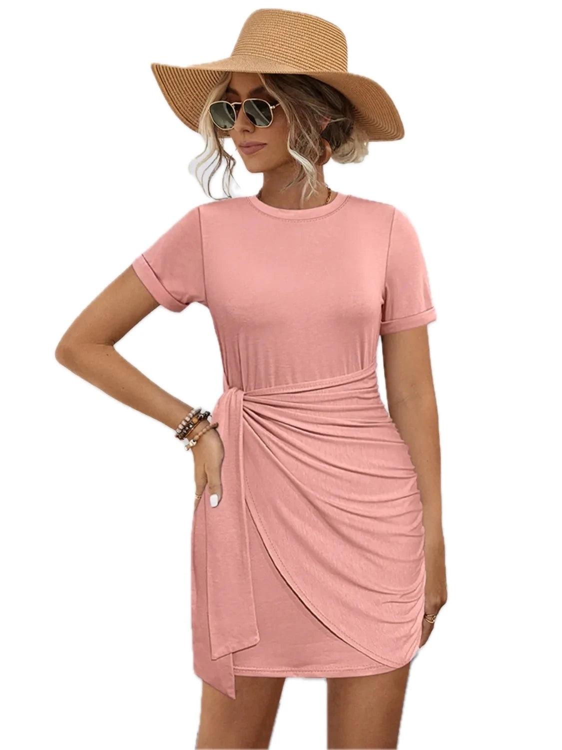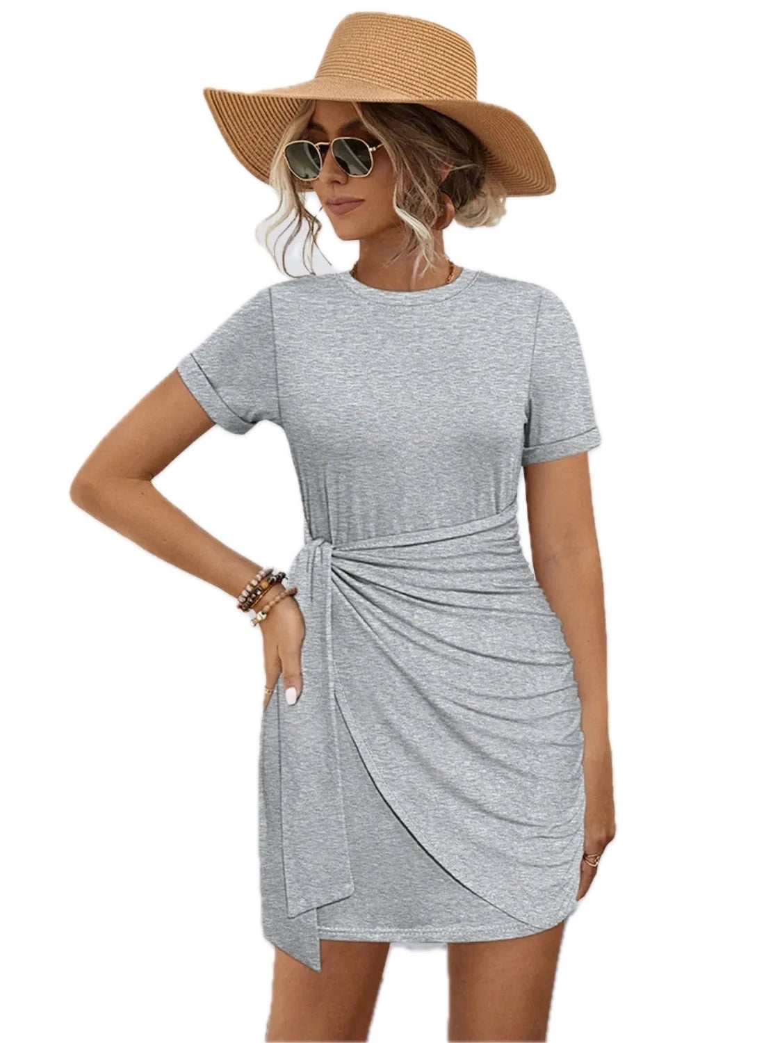 Women's Round Neck Short Sleeve Mini Tee Dress with Tie Front and Stretch Fit 95% polyester 5% elastane with chic fit