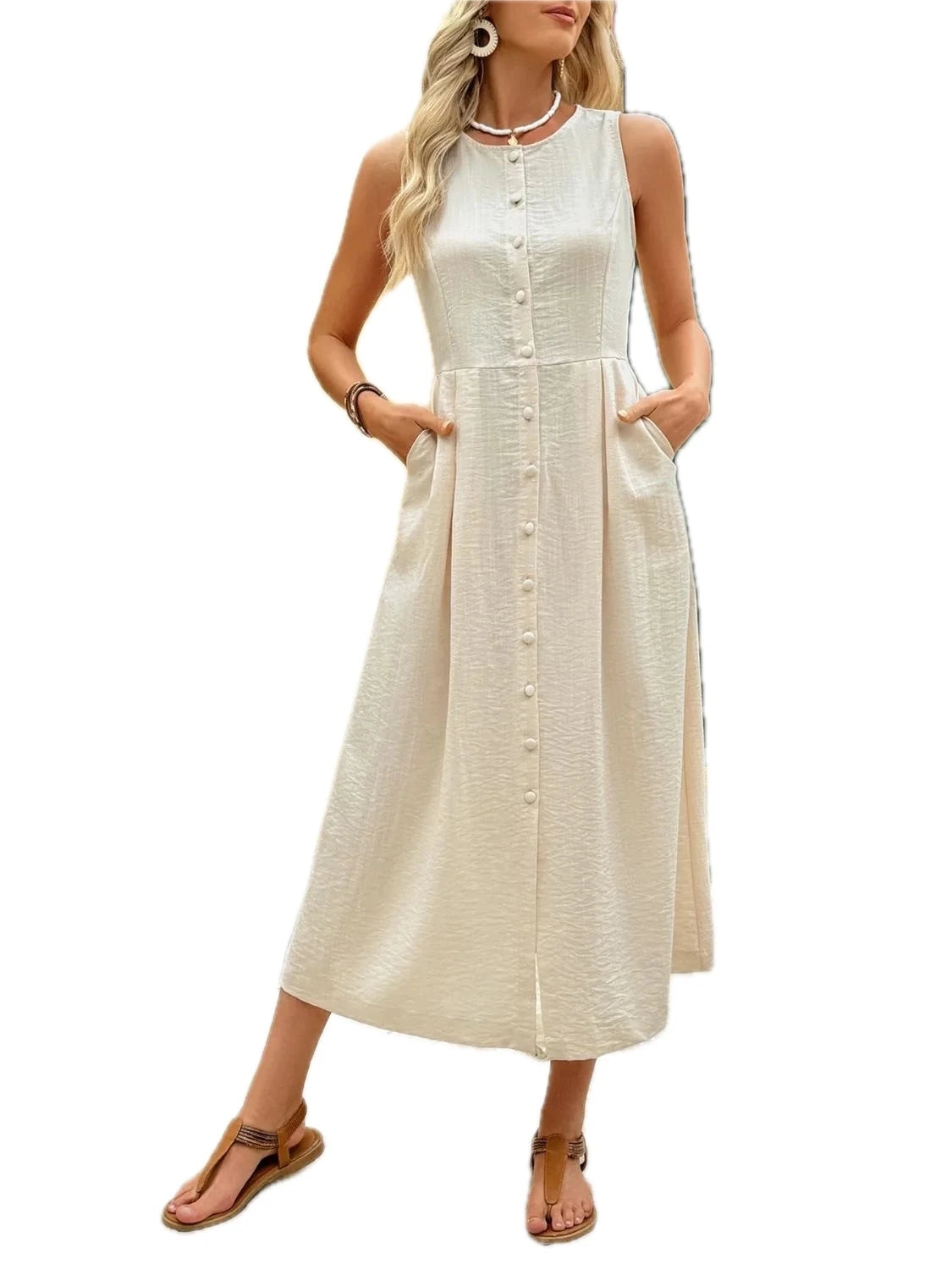 Women's Round Neck Midi Elegant Dress Buttoned Pockets Fifty two % viscose thirty five % polyester thirteen % polyamide