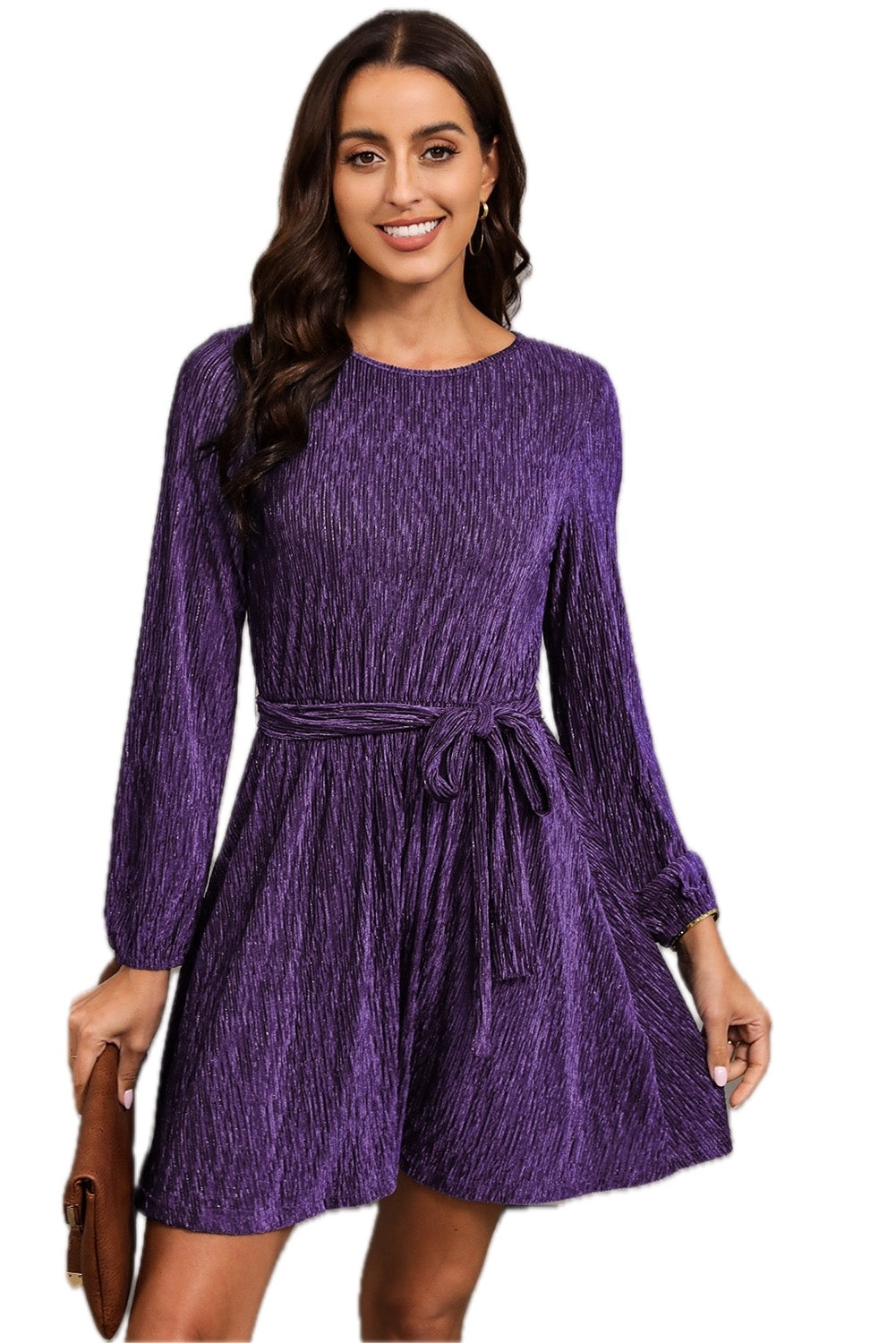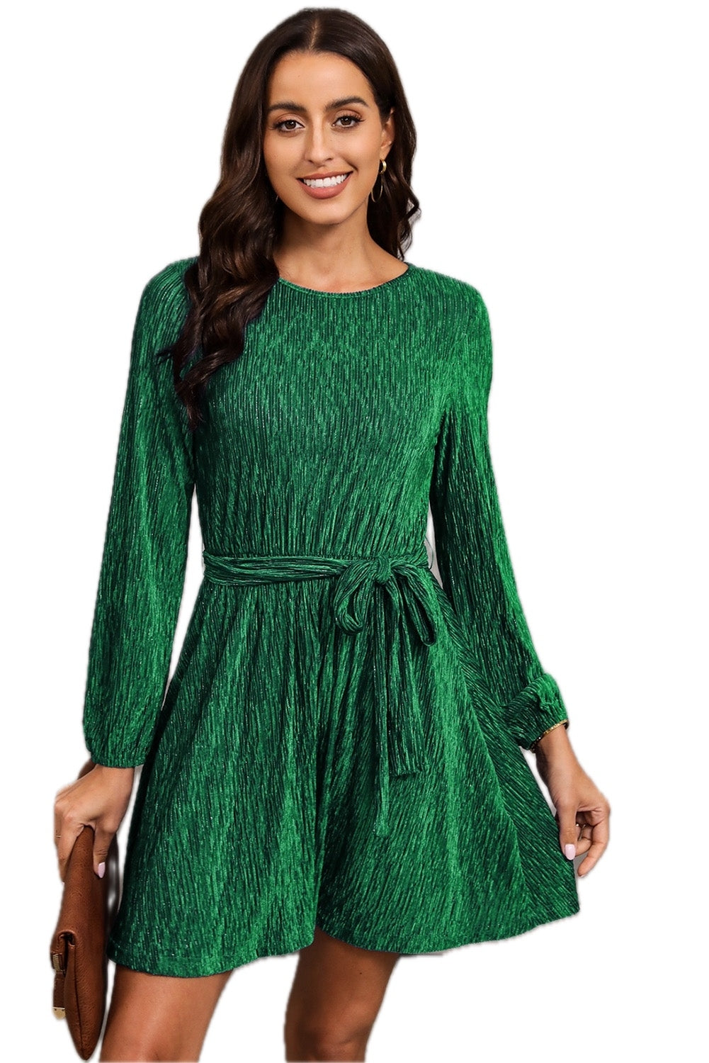 Women's Round Neck Tie Front Long Sleeve Dress with 95% Polyester and 5% Elastane for Elegant Everyday Wear for Work