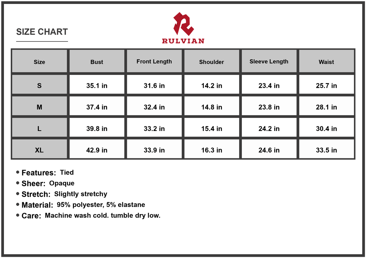 XL: front length 33.9 in, shoulder 16.3 in, bust 42.9 in, waist 33.5 in, sleeve length 24.6 in