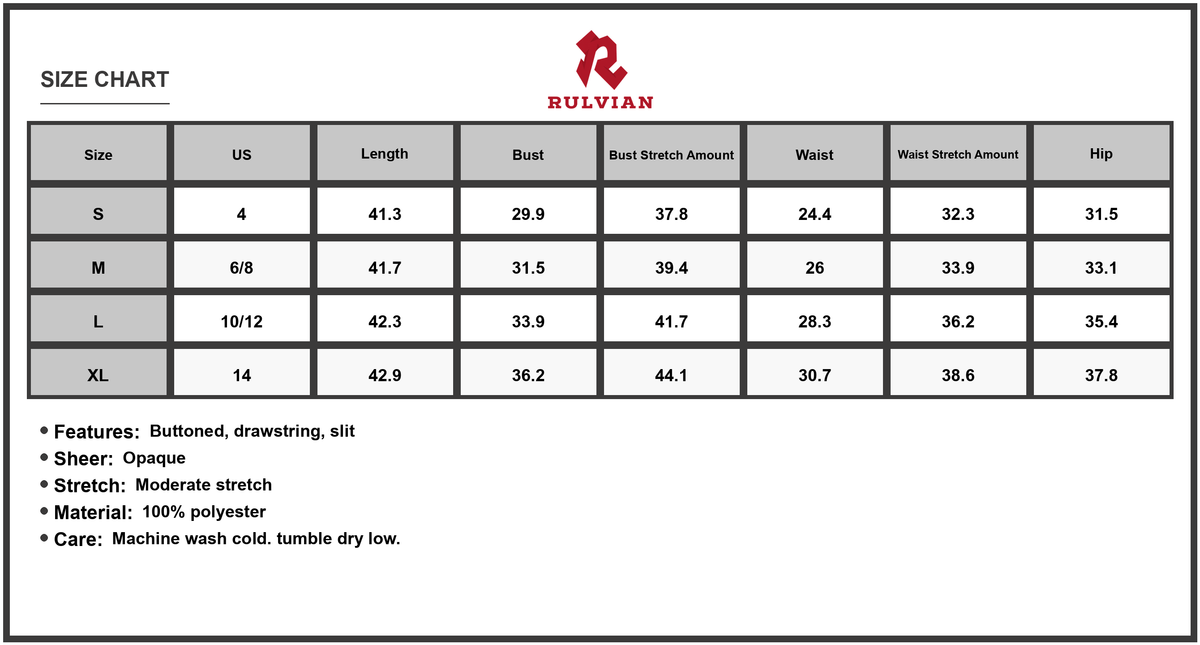 Size | US | Length | Bust | Bust Stretch Amount | Waist | Waist Stretch Amount | Hip |