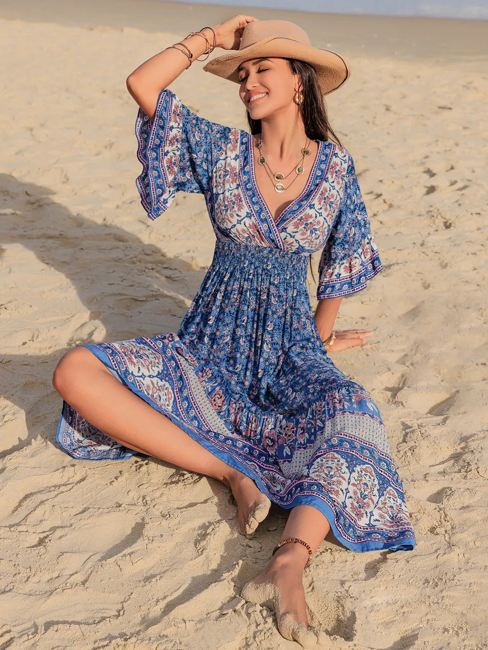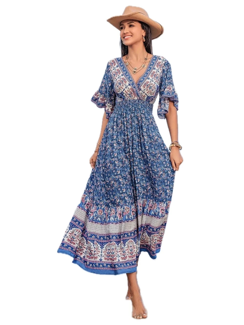 Women's Ruched Printed Flounce Sleeve Midi Dress 100% Viscose Fabric Feminine Silhouette for Day or Evening for events