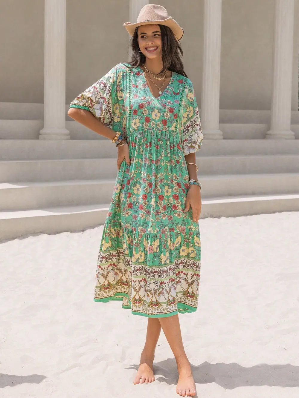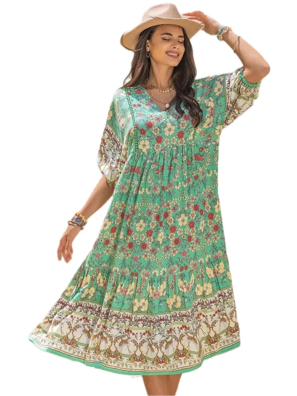Women's Ruched Printed Puff Sleeve Midi Dress 100% viscose Fabric With Sheer Overlay for Elegant Daytime or Evening Wear