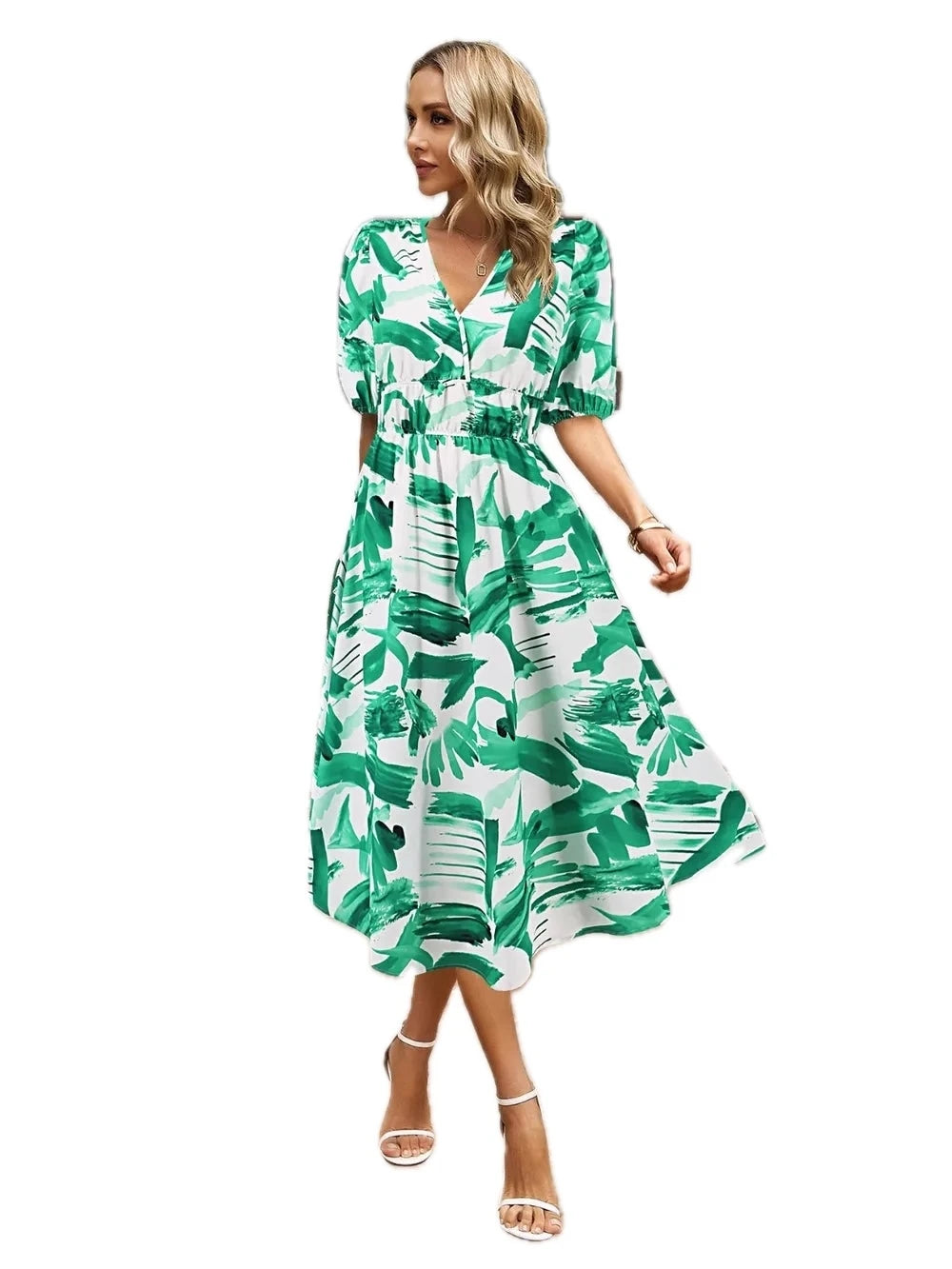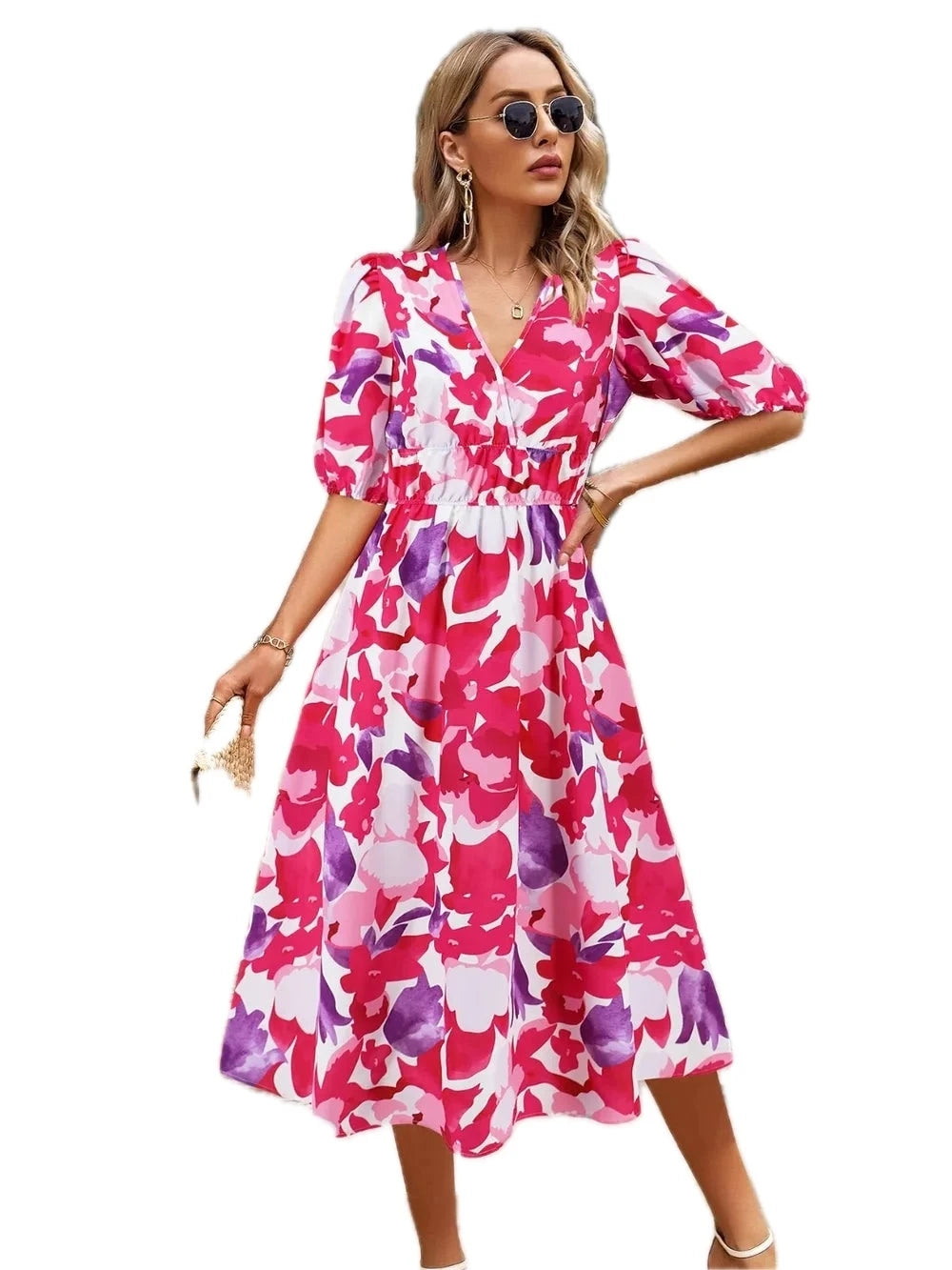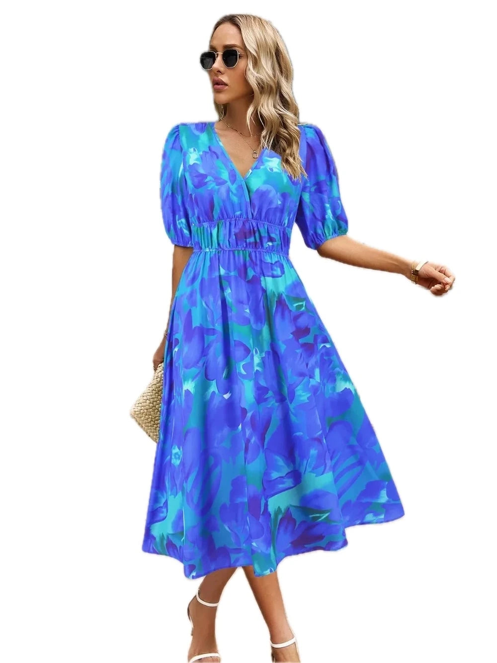 Women's Ruched Printed Surplice Short Sleeve Dress with Sheer Overlay Elegant Front Detail 95% polyester 5% spandex