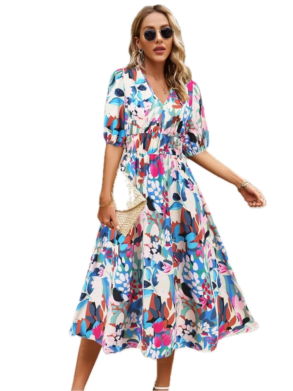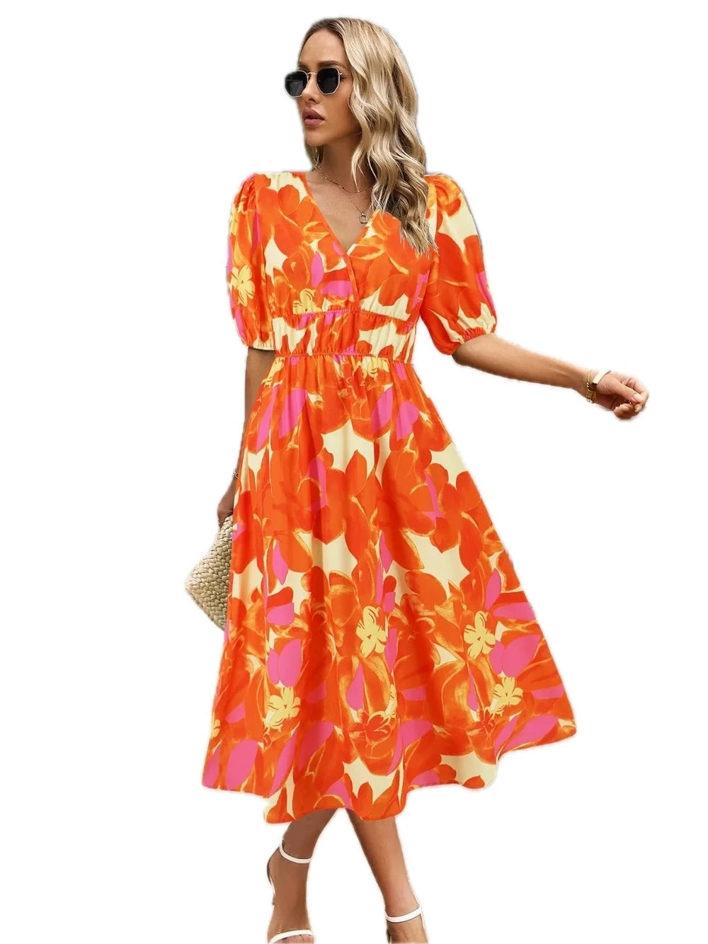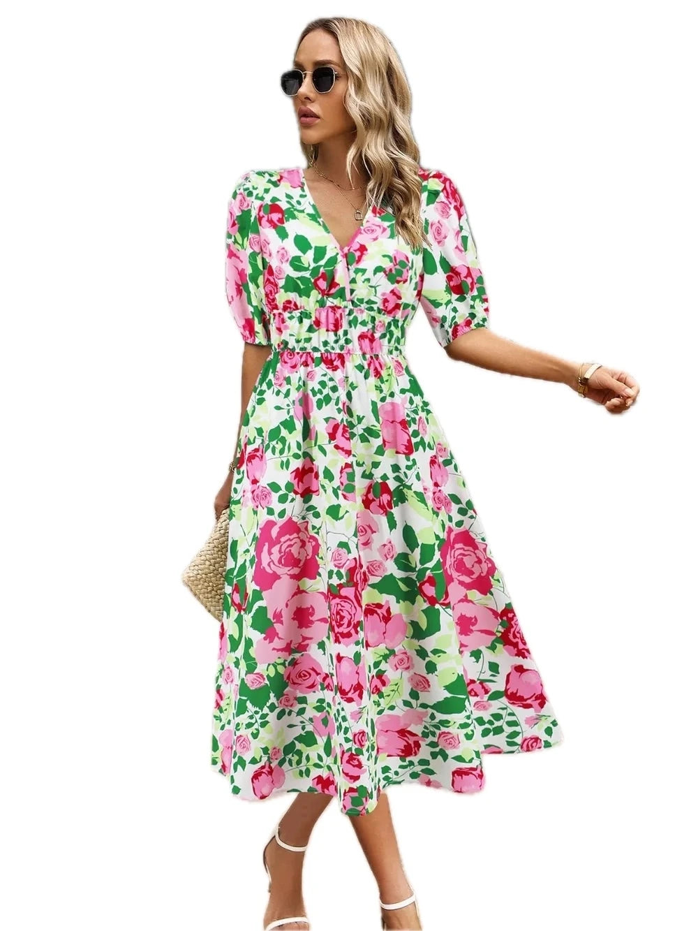 Women's Ruched Printed Surplice Short Sleeve Dress with Sheer Overlay Elegant Front Detail 95% polyester 5% spandex
