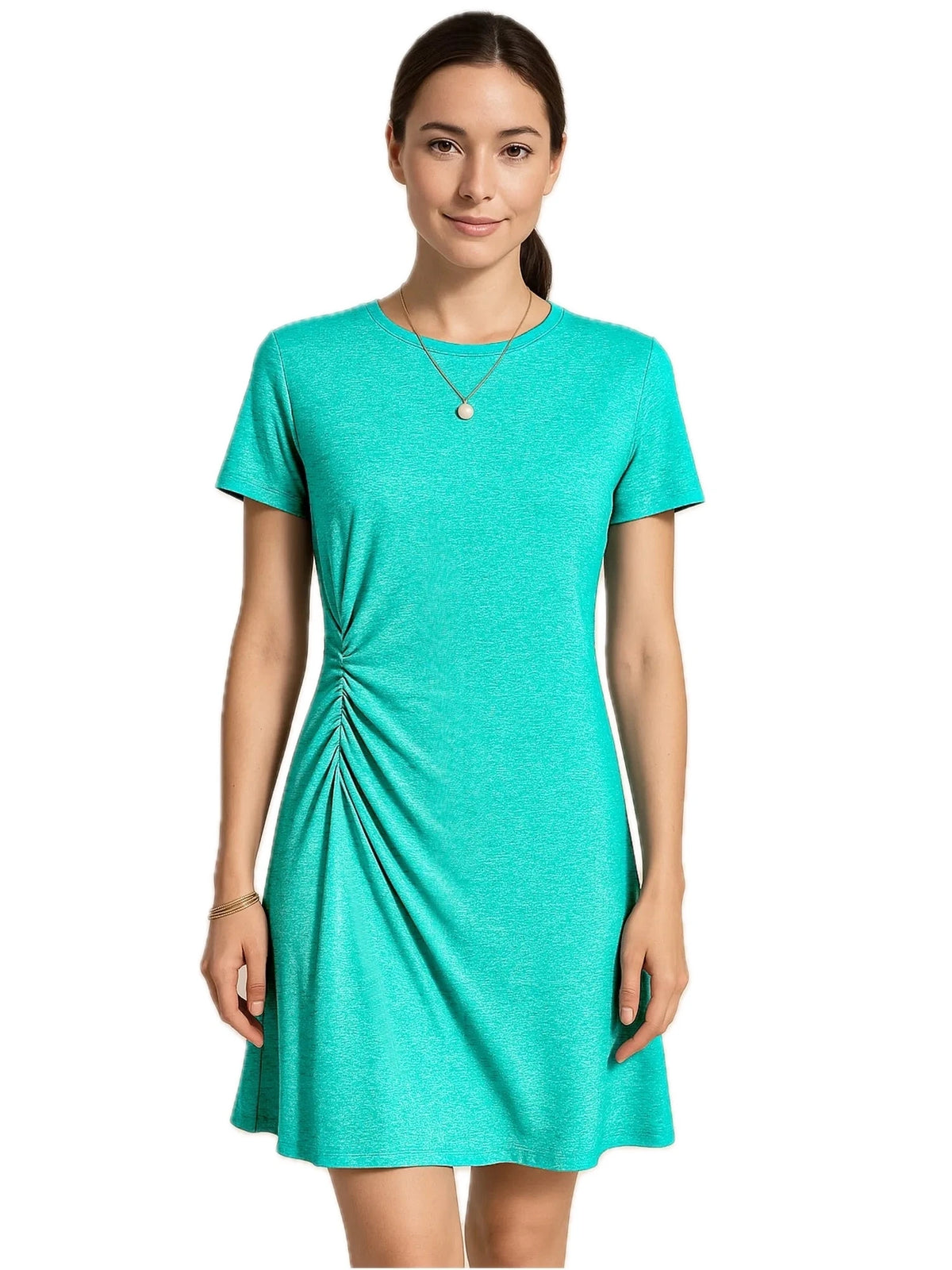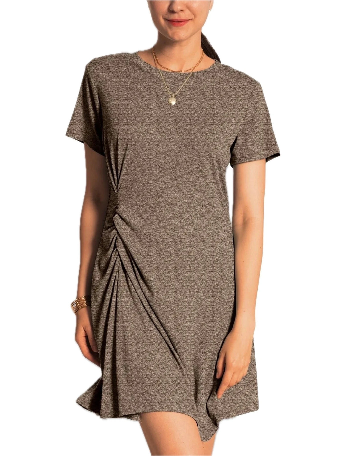 Women's Ruched Short Sleeve Mini Tee Dress with 95% polyester and 5% spandex for a flattering stretchable fit everyday